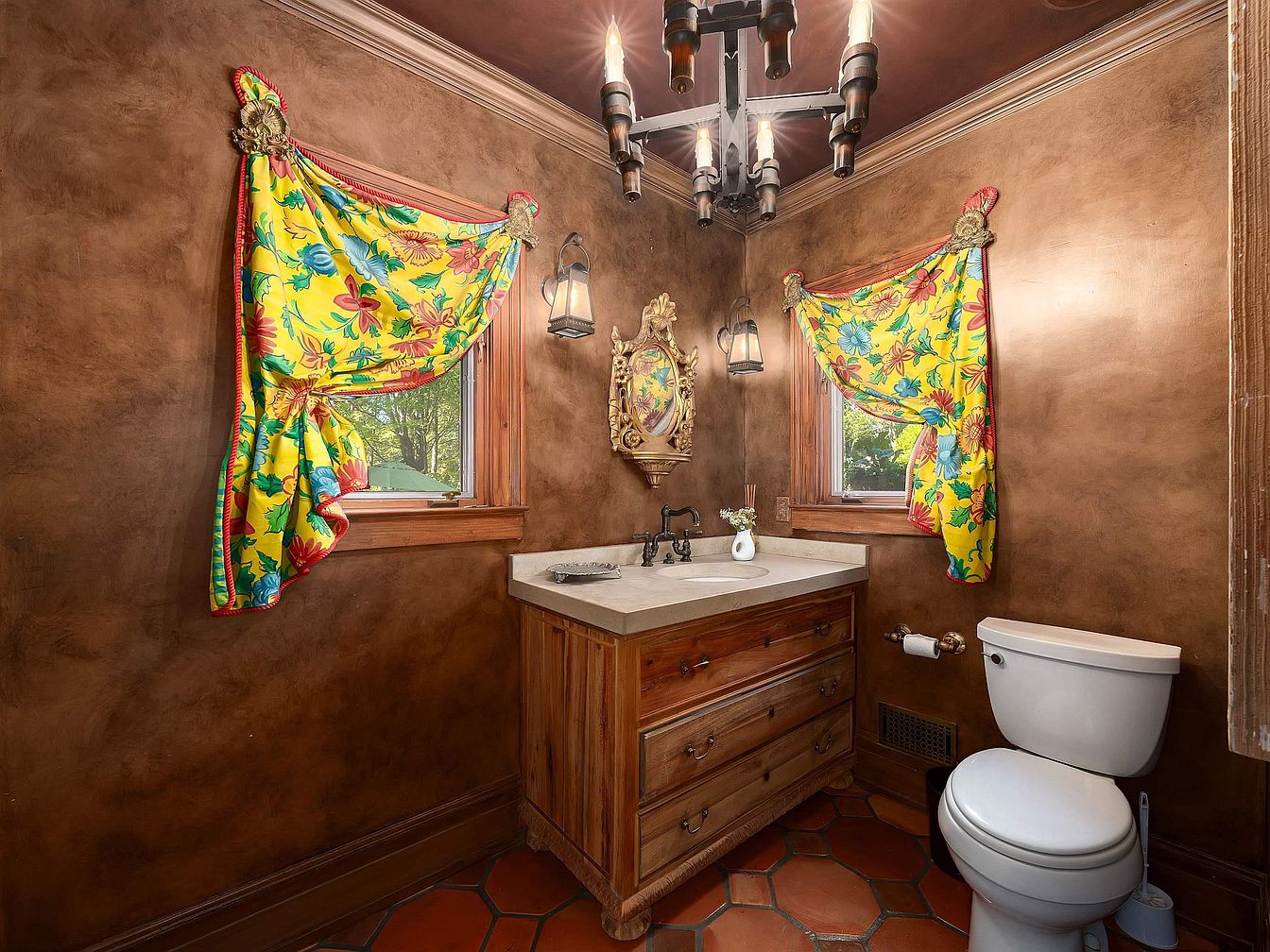 This powder room features a warm, earthy color palette with a rich brown textured wall, creating an inviting atmosphere. A sturdy wooden vanity with multiple drawers offers rustic charm, topped with a light countertop that contrasts softly. The vibrant yellow curtains adorned with floral patterns frame two windows, adding a cheerful pop of color. Simple wall-mounted lanterns provide functional lighting alongside an elegant chandelier, enhancing the room’s character. A classic white toilet complements the decor, while terracotta floor tiles ground the space, ensuring a cohesive blend of traditional and cheerful aesthetics in this cozy corner.