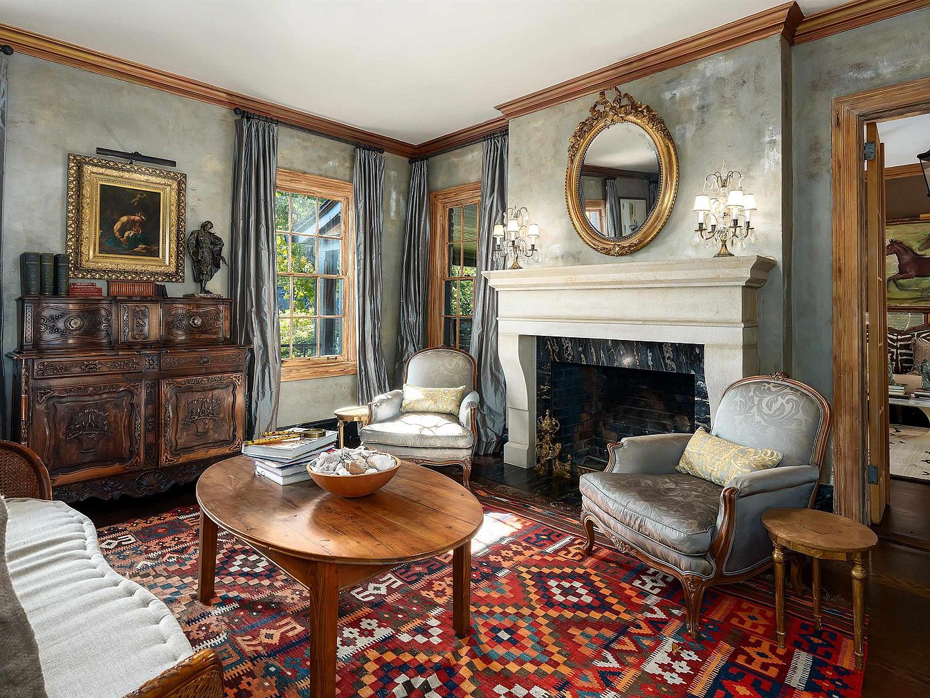 This cozy living room features an elegant arrangement, highlighted by an ornate stone fireplace with a classic circular mirror above. The walls exhibit a textured finish in muted colors, flanked by tall windows adorned with flowing gray drapes that enhance natural light. Rich wooden trim accents the space, complemented by a vintage wooden sideboard filled with artistic decor and books. The seating includes plush armchairs with soft upholstery and intricate detailing, surrounding a rustic round coffee table. A vibrant, patterned area rug adds warmth, while stylish wall sconces provide additional lighting, creating an inviting atmosphere.