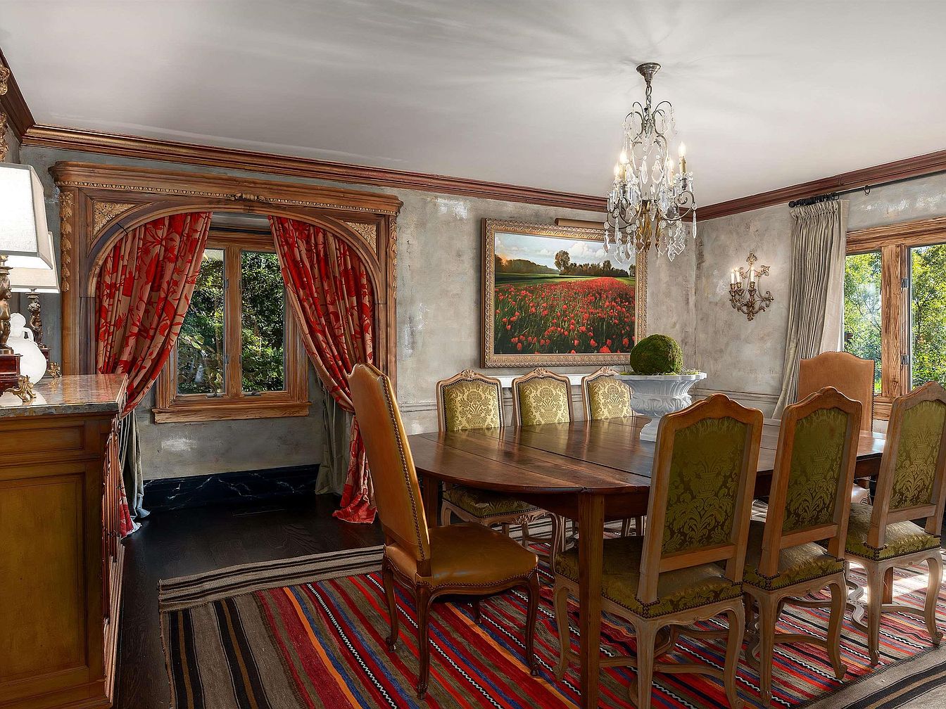This elegant dining room features a long wooden table surrounded by ornate chairs, showcasing intricate carvings and rich fabrics. The color palette combines warm wood tones with deep green upholstery and vibrant red curtains adorned with floral patterns. A stunning chandelier hangs from the ceiling, casting a warm glow over the space. Large windows are framed with soft drapes, allowing natural light to illuminate the room. A colorful striped rug anchors the seating area, enhancing the room’s aesthetic. Artwork depicting a flower garden adorns the wall, creating a serene focal point and adding a touch of sophistication.