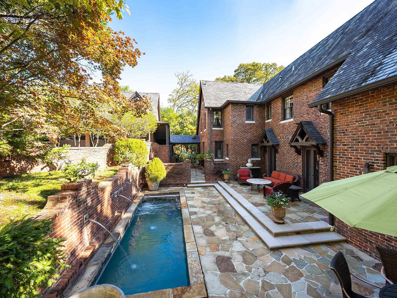 This backyard showcases a beautifully designed outdoor space featuring a sleek swimming pool bordered by natural stone coping. The area is surrounded by lush greenery, including a vibrant tree and carefully trimmed shrubs. A charming stone pathway leads to a cozy seating arrangement, with red cushioned chairs and a circular table, creating an inviting spot for relaxation. The textured brick walls of the home add warmth, while the steep, slate roof contributes to the house’s historic character. A colorful parasol provides shade, enhancing the overall tranquil atmosphere, perfect for enjoying sunny days.