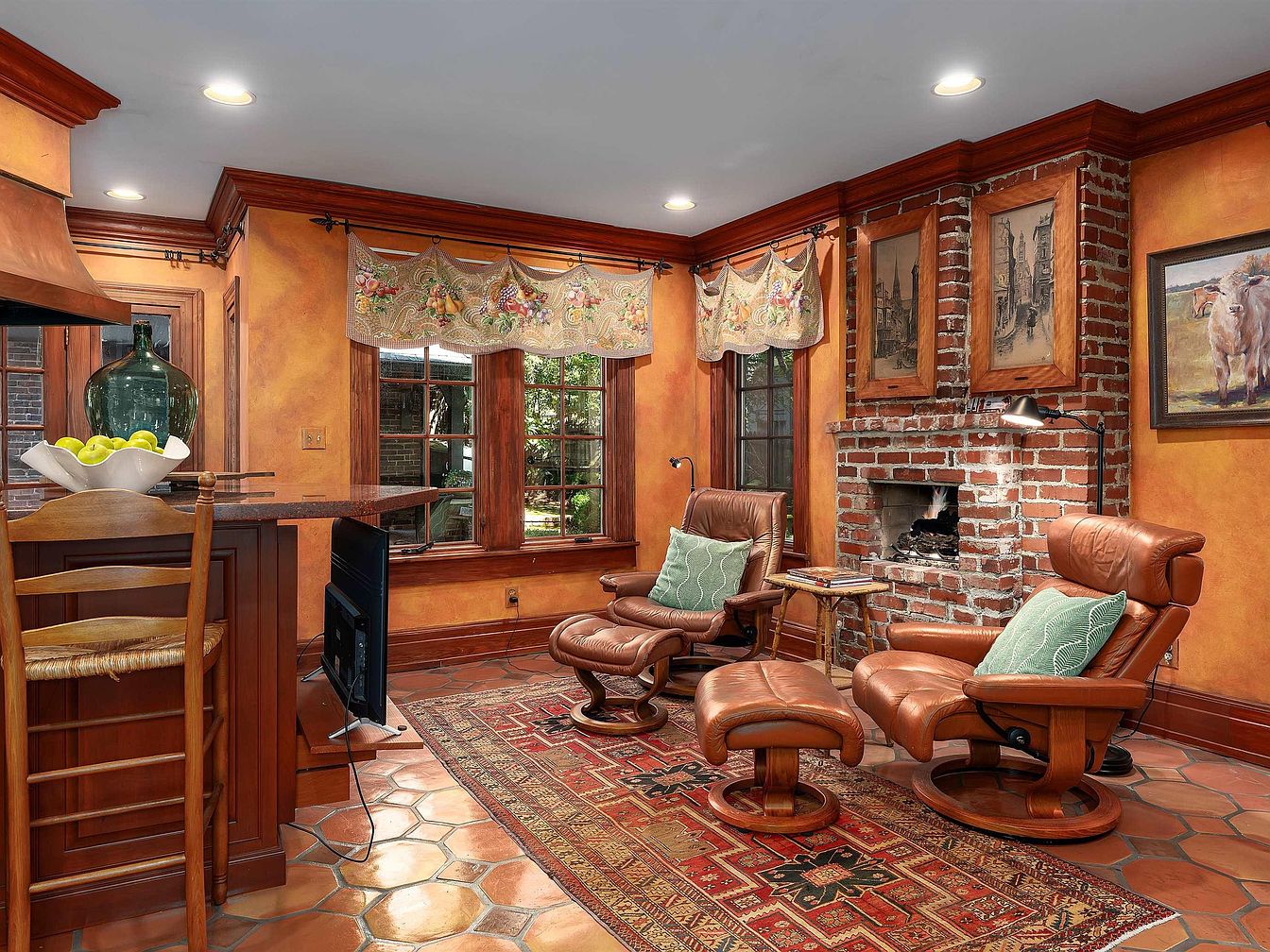 This cozy living area features warm, earthy tones, highlighted by the rich orange walls and wooden accents. Two leather recliners, in soft brown, are complemented by decorative cushions. A textured area rug in deep red enhances the comfort of the space. The exposed brick fireplace serves as a charming focal point, surrounded by framed artwork that adds character. Above the windows, a floral curtain introduces a touch of softness, framing the views of the garden outside. A small bar area with a glossy countertop showcases a bowl of citrus, adding a fresh, inviting detail to this intimate setting.