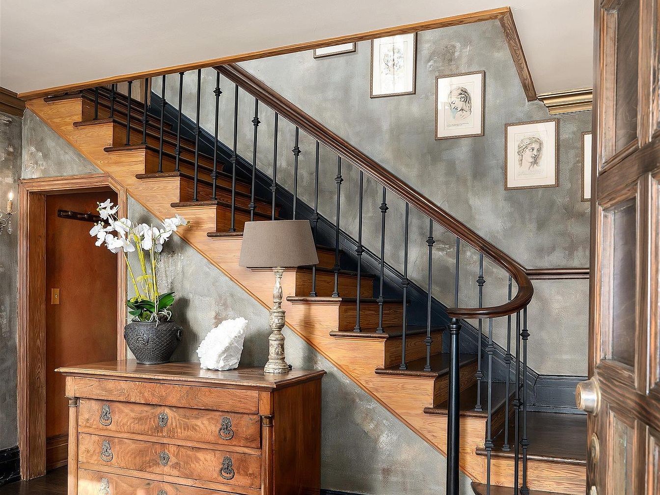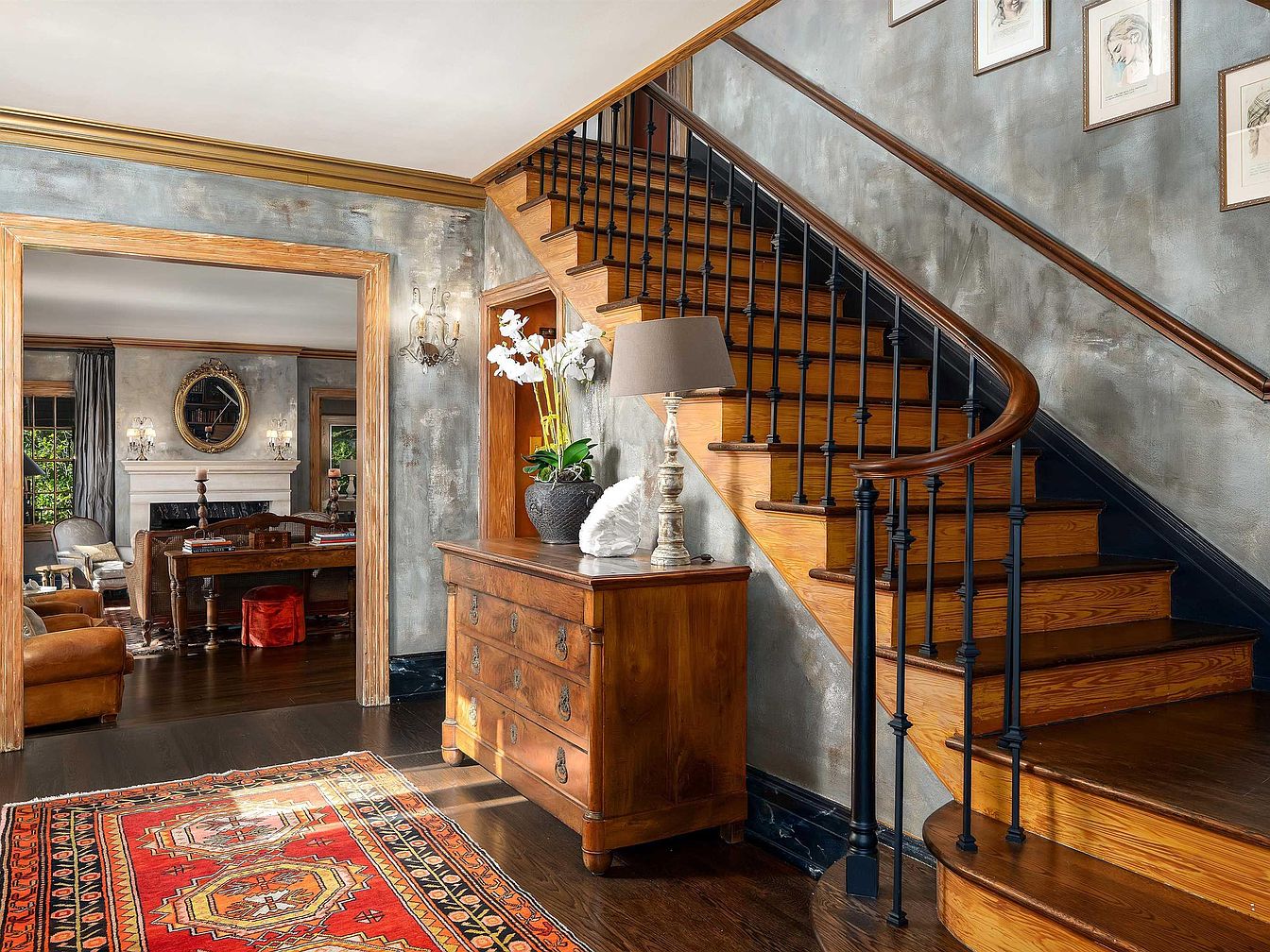 A warm and inviting entryway features a graceful staircase with rich wooden steps and a polished handrail, complemented by black metal balusters. The walls exhibit a muted, textured gray finish, enhancing the rustic charm. A vintage wooden chest provides storage, adorned with a decorative lamp and a vase of fresh flowers, adding a touch of elegance. A vibrant Persian rug lies underfoot, infusing the space with color and warmth. To the left, an open arch reveals a cozy living area, showcasing classic furniture and an ornate mirror. Subtle lighting fixtures enhance the room’s welcoming atmosphere.