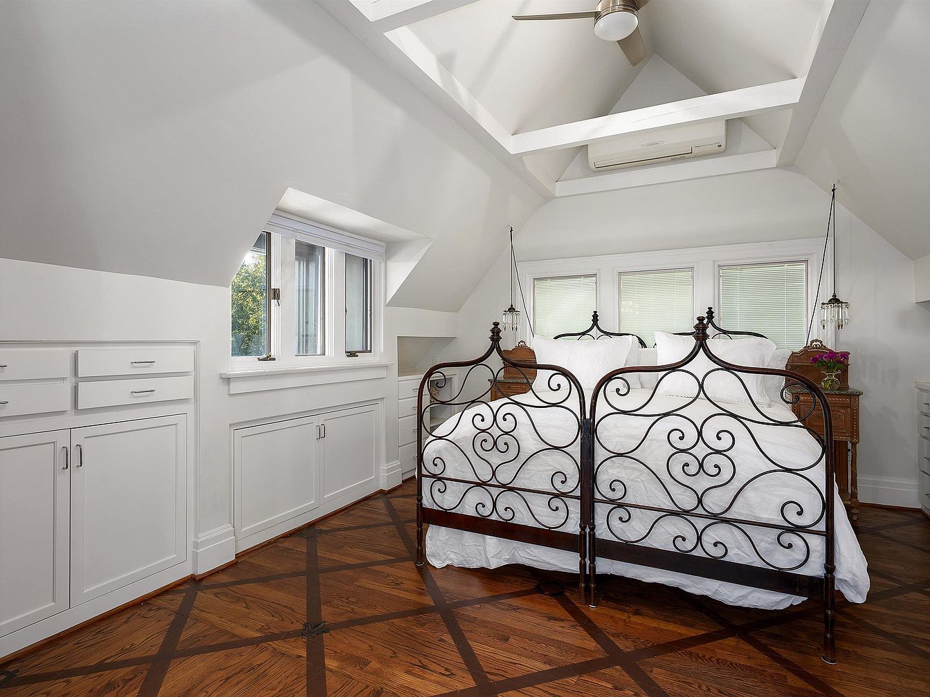 This cozy bedroom features a unique sloped ceiling that enhances its spacious feel. A striking wrought-iron bed frame with intricate scrollwork stands out, adorned with plush white bedding. Natural light floods the space from large windows, complemented by sheer blinds. The hardwood floor showcases an elegant geometric pattern of darker woods, adding texture and warmth. Built-in cabinetry lines one wall, offering efficient storage with a clean white finish. A vintage nightstand hosts a small bouquet, adding a touch of color. Minimalist black pendant lights maintain an airy ambiance, harmonizing modern and classic design elements.
