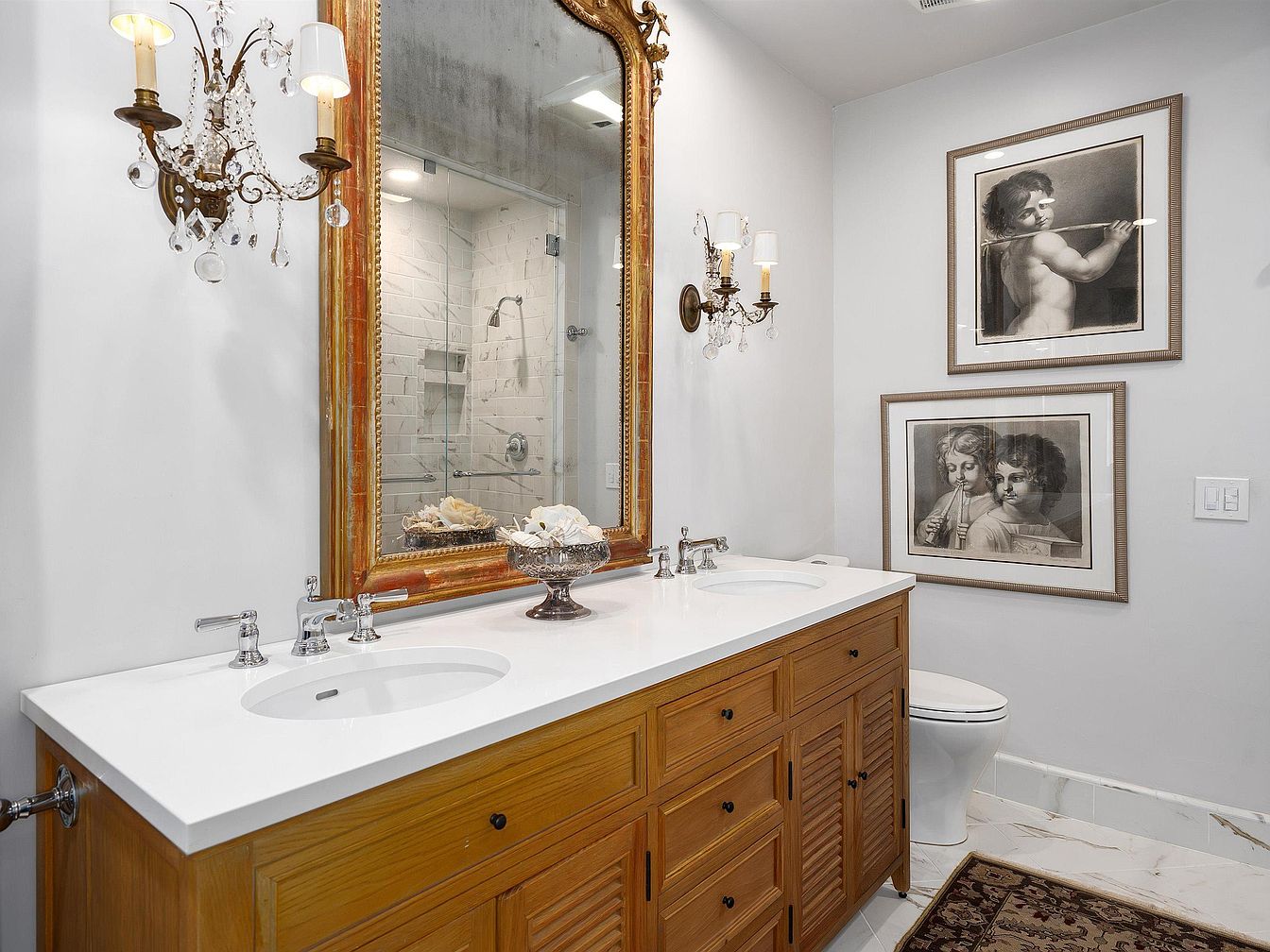 The bathroom features a spacious double vanity topped with a sleek white countertop, enhancing the clean, modern aesthetic. Below, a warm wood finish adds a rustic charm through cabinetry with louvered doors, providing both style and storage. Flanking the vanity are elegantly designed wall sconces with glass accents, while a grand, ornately framed mirror reflects light and adds depth. The walls are painted in a soft gray, complemented by framed vintage artwork showing classical figures, which introduces a refined, artistic touch. The flooring features polished marble tiles, accentuated by a decorative rug that adds comfort and warmth.
