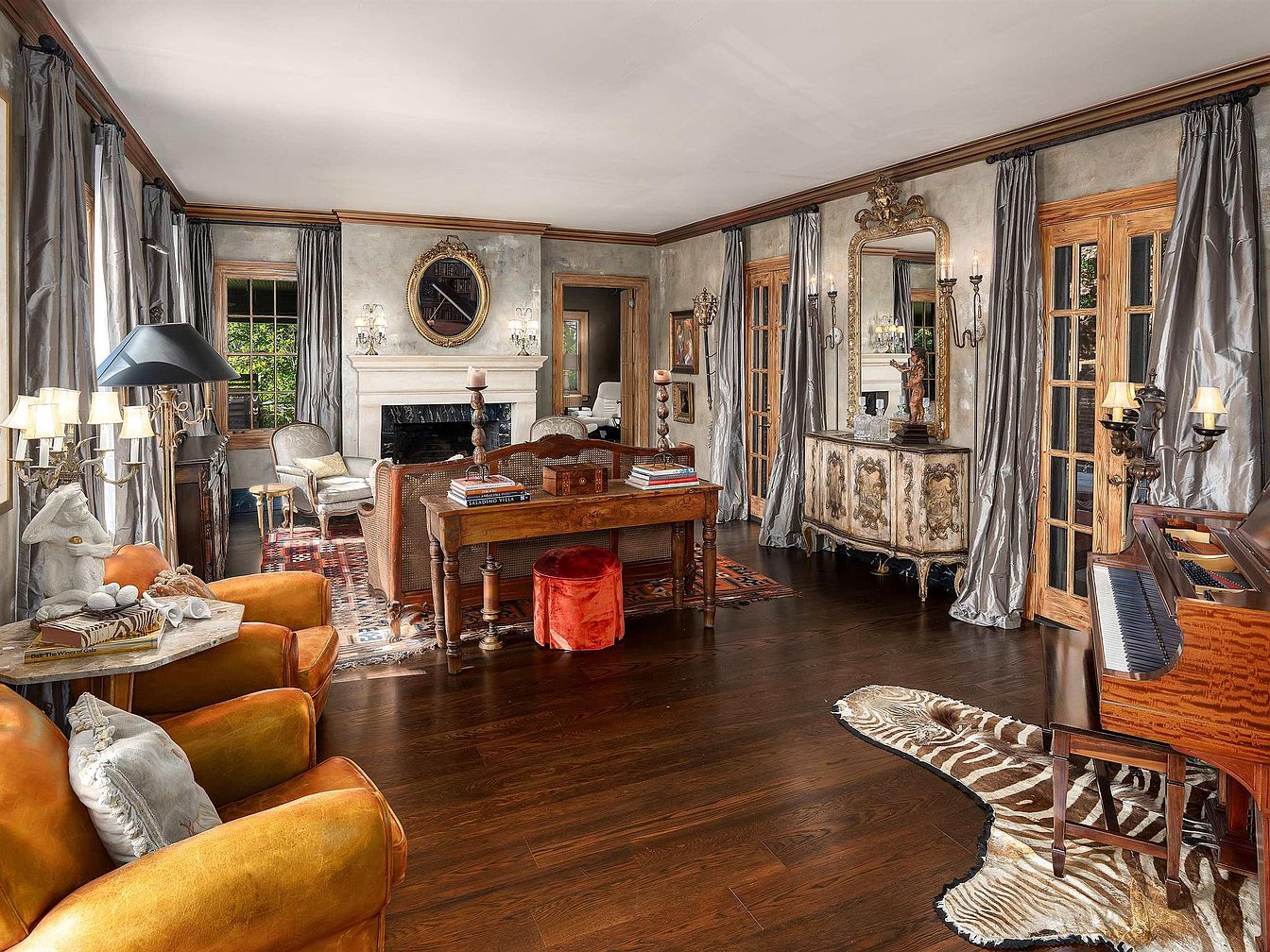 This living room features an inviting arrangement with a rich brown wood floor. Soft gray drapes frame tall windows, allowing natural light to flood in, while a classic stone fireplace adds warmth. Vintage-inspired furniture includes a beautifully curved wooden desk and a stylish, ornate sideboard with intricate detailing. Two vibrant orange leather chairs provide a pop of color, complemented by a plush zebra-patterned rug beneath a grand piano. Elegant accents such as candle sconces and a large round mirror enhance the sophistication of the space, blending historical charm with contemporary decor, creating a cozy yet refined atmosphere.