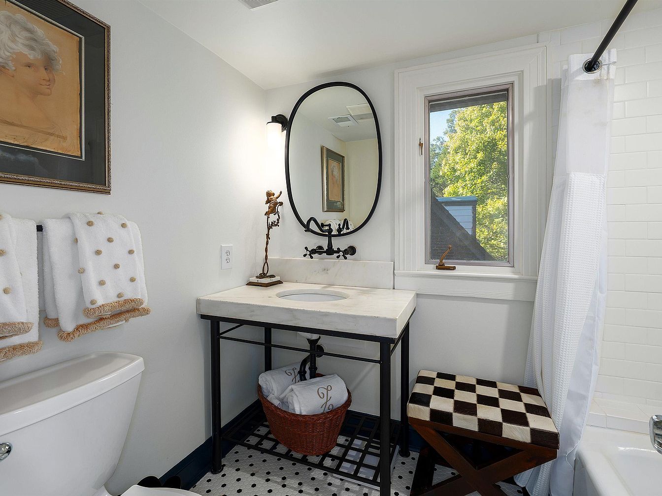 The bathroom features a stylish blend of modern and classic elements. A round black framed mirror hangs above a minimalist white marble sink, which is supported by a black metal frame. The walls are painted a soft white, enhancing the room’s brightness. Elegantly framed artwork adds a touch of sophistication. To the left, fluffy white towels with tassels hang neatly, while a sleek toilet sits adjacent. The floor showcases a striking black and white patterned tile. A wooden checkered stool offers additional seating, complemented by natural light streaming through a window, illuminating the space.