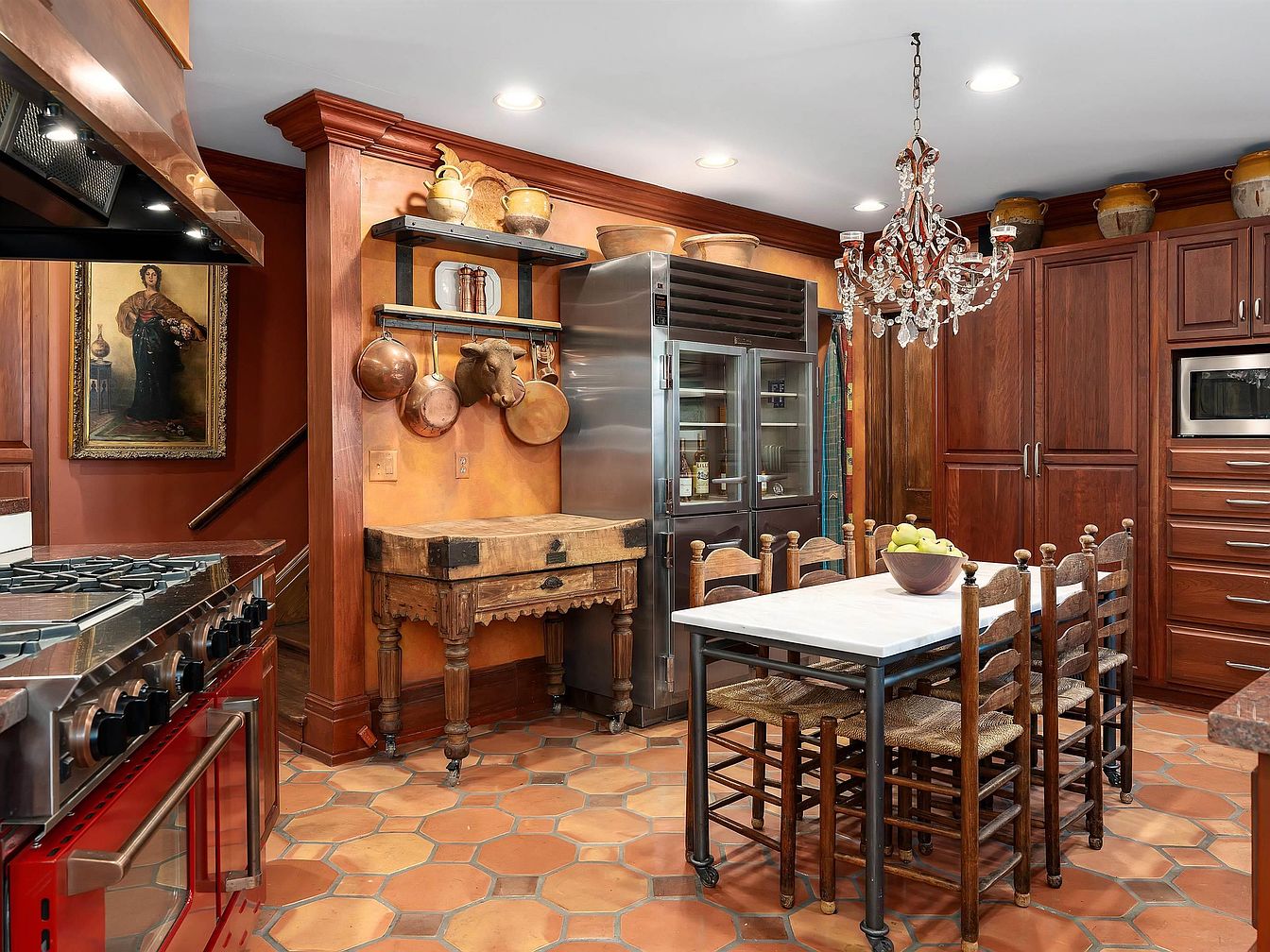 This kitchen blends rustic charm with modern touches. Terracotta tile flooring complements warm, earthy walls, adorned with a vintage painting. The rich wooden cabinetry and shelves showcase copper pots and decorative items. A spacious marble-topped dining table surrounded by six wooden chairs invites casual gatherings. An elegant chandelier hangs above, adding a touch of sophistication. The bright red oven stands out against the muted tones, while sleek metallic appliances enhance functionality. Overall, this kitchen offers a cozy yet refined atmosphere, balancing traditional presence with contemporary efficiency.