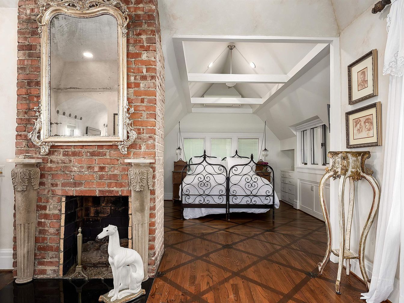 This cozy bedroom showcases a blend of rustic charm and elegance. The focal point is a wrought-iron bedframe adorned with intricate designs, complemented by pristine white bedding. A striking brick fireplace with a vintage mirror above adds warmth and character, while decorative stone pedestals frame the fireplace. The hardwood floor features a classic diagonal pattern, enhancing the room’s sophistication. Soft, neutral walls contrast the vibrant wooden elements, creating a cozy ambiance. To the side, a unique decorative stand shares space with framed art, contributing to the room’s artistic vibe. Natural light floods the space through large windows, enhancing its inviting atmosphere.