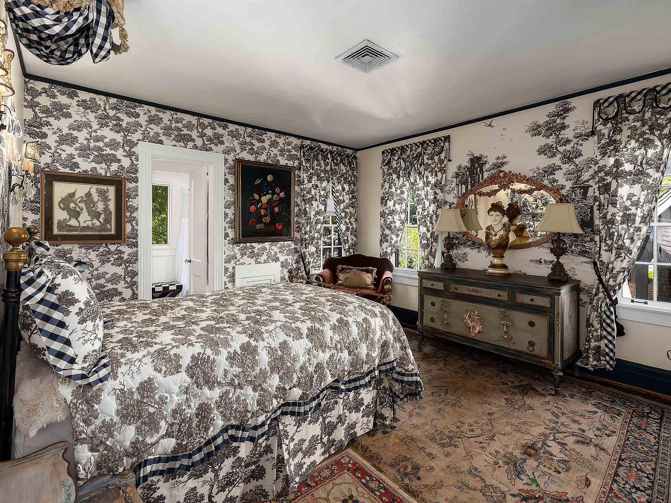 This historic bedroom features intricate toile-patterned wallpaper in sepia tones, creating a timeless elegance. A plush, tufted burgundy settee complements the bed, which is adorned with a richly patterned quilt and enhanced with plaid accents. The space is anchored by an ornate, vintage dresser with floral embellishments, beside two classical lamps providing soft lighting. Framed art pieces hang alongside large, patterned curtains that frame the windows, allowing natural light to illuminate the room. An area rug adds warmth and texture, enhancing the inviting atmosphere while the black trim outlines the architectural details, unifying the decor.