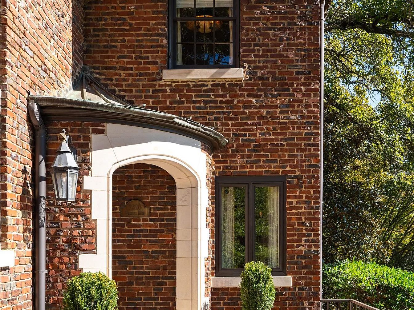 This image showcases the entrance of a historic American home, featuring a classic brick facade that exudes warmth. The reddish-brown bricks create a rich texture alongside the smooth, pale stone trim that frames the porch. An arched doorway invites entry, flanked by elegant foliage. A decorative lamp is mounted beside the entrance, adding charm and functionality. The window above, with dark framing, contrasts elegantly with the brick and highlights the sophisticated architectural design. The overall aesthetic combines historic elegance with contemporary touches, emphasized by the lush greenery surrounding the doorway.