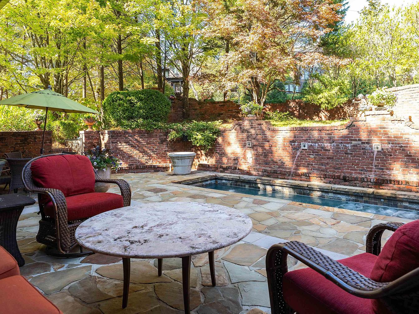 A tranquil backyard patio showcases a natural stone floor with a mix of warm colors. Two inviting wicker chairs, adorned with plush red cushions, frame a circular table with a marble top. An umbrella in a refreshing green hue provides shade, enhancing the outdoor ambiance. Behind, a textured brick wall adds rustic charm, complemented by vibrant greenery and flowering plants. A narrow pool glimmers in the background, lined by a continuation of the natural stone. Soft sunlight filters through the trees, casting tranquil patterns on the patio, creating an ideal space for relaxation and outdoor gatherings.