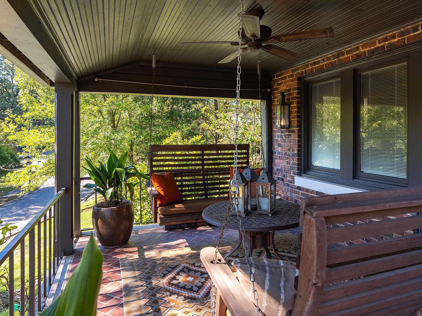 This inviting front porch features a blend of warm wood tones and natural elements. A traditional swing, adorned with an orange cushion, hangs beside a round, intricately designed iron table. A potted plant adds greenery, complementing the earthy palette. The floor is covered with a patterned rug, enhancing texture and warmth, while the ceiling showcases rich, dark wood paneling. Large windows framed in dark trim allow natural light to filter in, highlighting the textured brick wall. Soft lanterns and the overhead fan contribute to a cozy ambiance, creating a perfect space for relaxation and outdoor enjoyment.