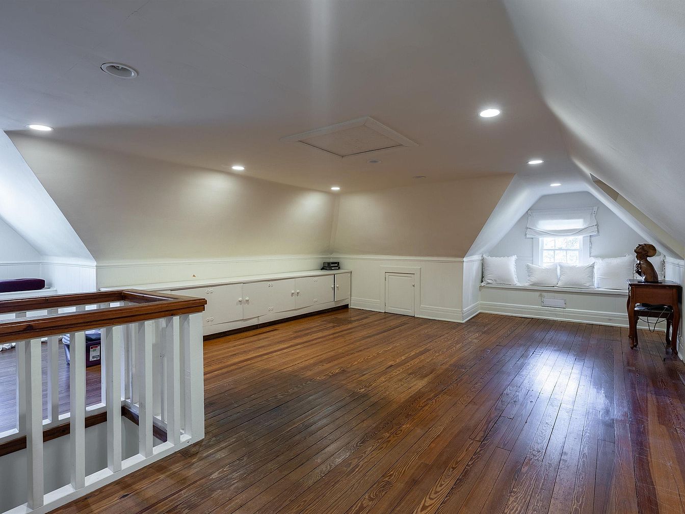 This airy attic features a slanted ceiling with clean lines and a soft color palette. The walls are painted a warm white, enhancing the natural light from the window. A cozy seating nook is adorned with fluffy white pillows, inviting relaxation amidst the elegant simplicity. Rich, polished hardwood floors add warmth and character, complemented by built-in storage along the walls, optimizing space while maintaining a tidy appearance. Recessed lighting provides a modern touch, illuminating the room without detracting from its historical charm. A small antique table with a decorative sculpture subtly highlights the room’s sophisticated style.