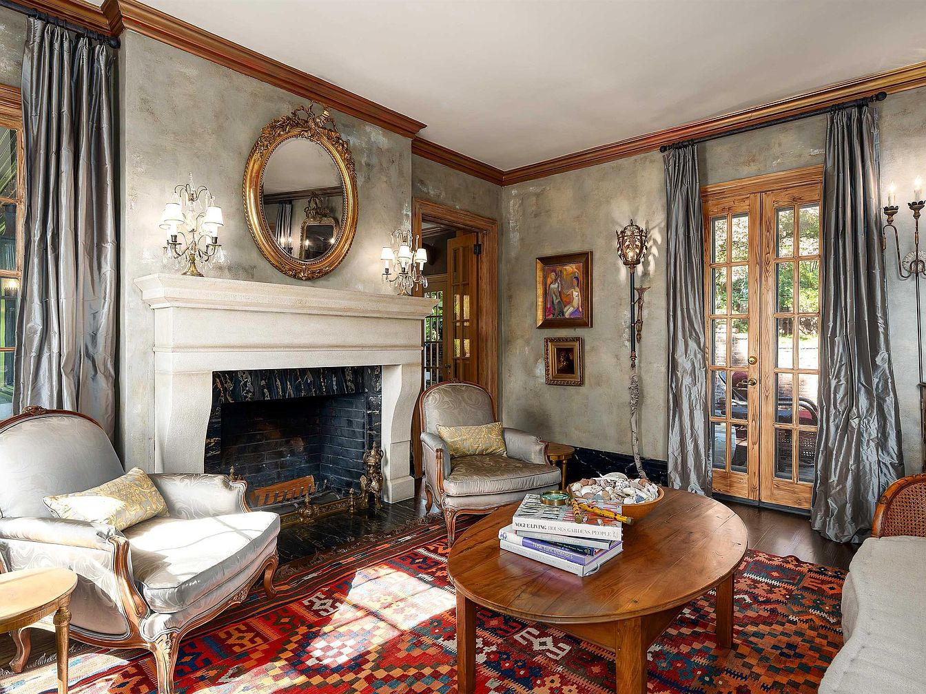 This living room features a sophisticated blend of vintage charm and modern elegance. A grand fireplace with a sleek stone mantle anchors the space, while a vibrant, patterned area rug adds warmth beneath a round wooden table. Flanking the fireplace are two plush, light gray armchairs, accented with golden cushions. Rich hardwood flooring complements the dark marble hearth. Textured walls in soft gray enhance the room’s ambiance, and luxurious drapes frame the large windows, allowing natural light to filter in. Decorative sconces and a central mirror add to the allure, capturing the room’s inviting essence.