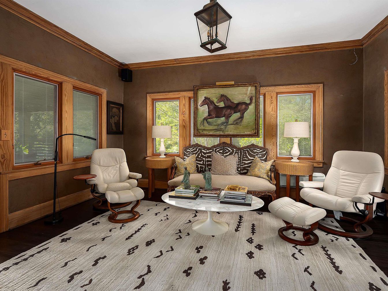 This cozy reading nook features a warm, earthy color palette with brown walls and rich wood trim. Plush, white leather chairs are complemented by a distinctive patterned sofa adorned with various textured pillows. A circular marble coffee table sits at the center, adorned with stacked books and decorative elements. Natural light floods in through the large windows, flanked by blinds, creating an inviting atmosphere. A rustic horse painting hangs prominently above the sofa, drawing attention and adding character. The area rug, with an organic print, enhances the room’s overall warmth and comfort.