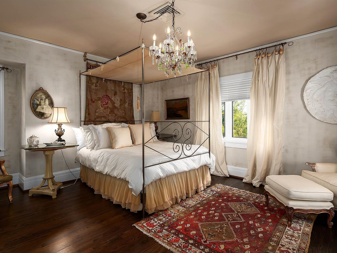 A cozy bedroom featuring a four-poster bed adorned with a white ruffled comforter and golden accents. The canopy showcases a delicate chandelier, adding elegance to the space. Soft beige walls provide a warm ambiance, complemented by rich hardwood flooring. A vintage side table with a decorative lamp sits beside the bed, while an intricately patterned red and gold area rug anchors the space. A plush chaise lounge in cream invites relaxation. Framed artwork and a window dressed with flowing curtains enhance the room’s charm, allowing natural light to infuse the area, creating a serene and inviting atmosphere.