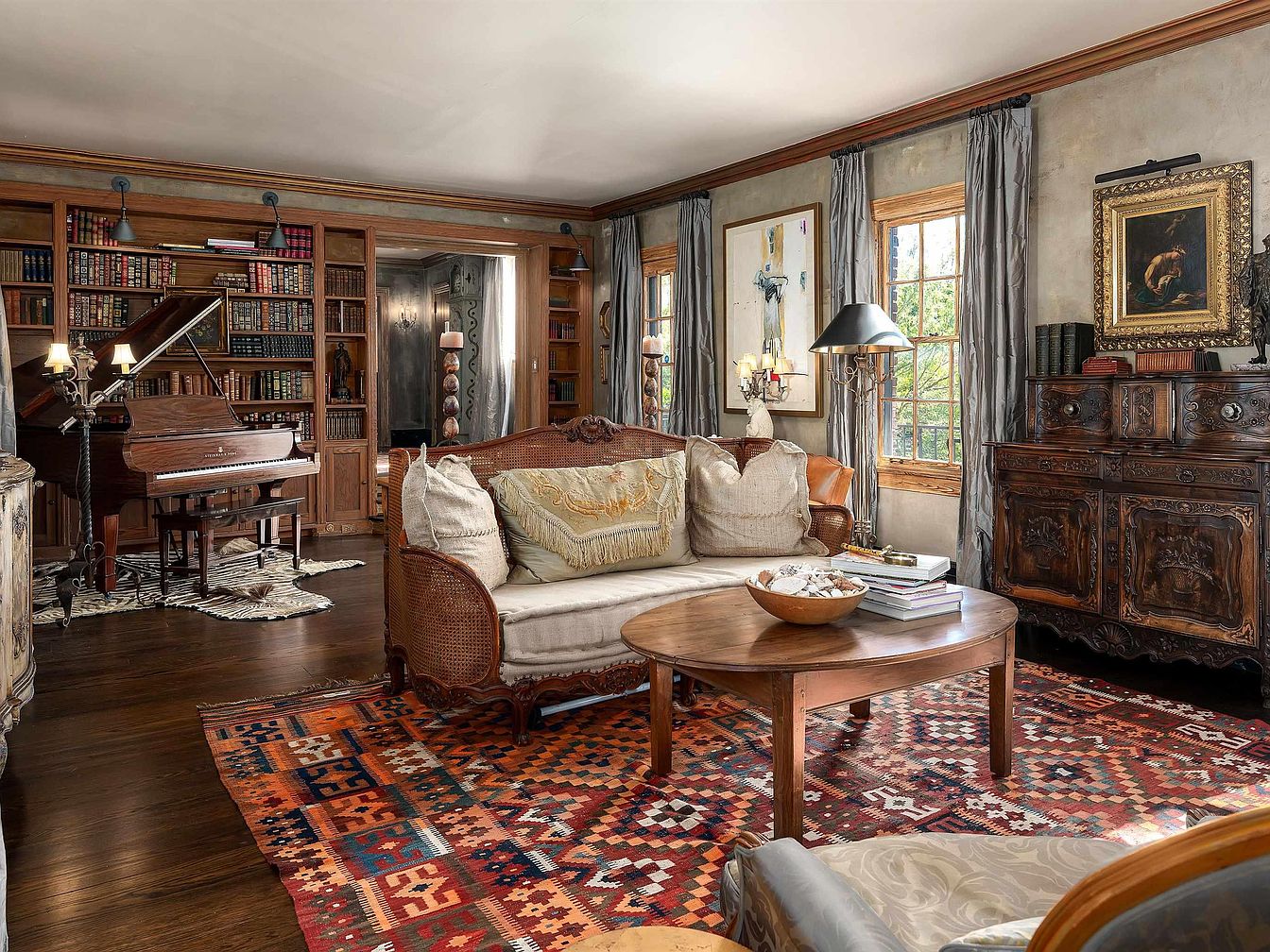 The living room features a warm, inviting atmosphere with a mix of classic and contemporary styles. A large, ornate rug with vibrant patterns anchors the space, complemented by a round wooden coffee table at its center. A plush, antique couch with soft cushions faces a polished grand piano, adding an element of sophistication. The walls are adorned with a combination of detailed artwork and built-in bookshelves filled with an array of books, showcasing intellectual charm. Large windows allow natural light to flood the room, highlighting the rich tones of wooden accents and furnishings, creating a cozy yet elegant ambience.