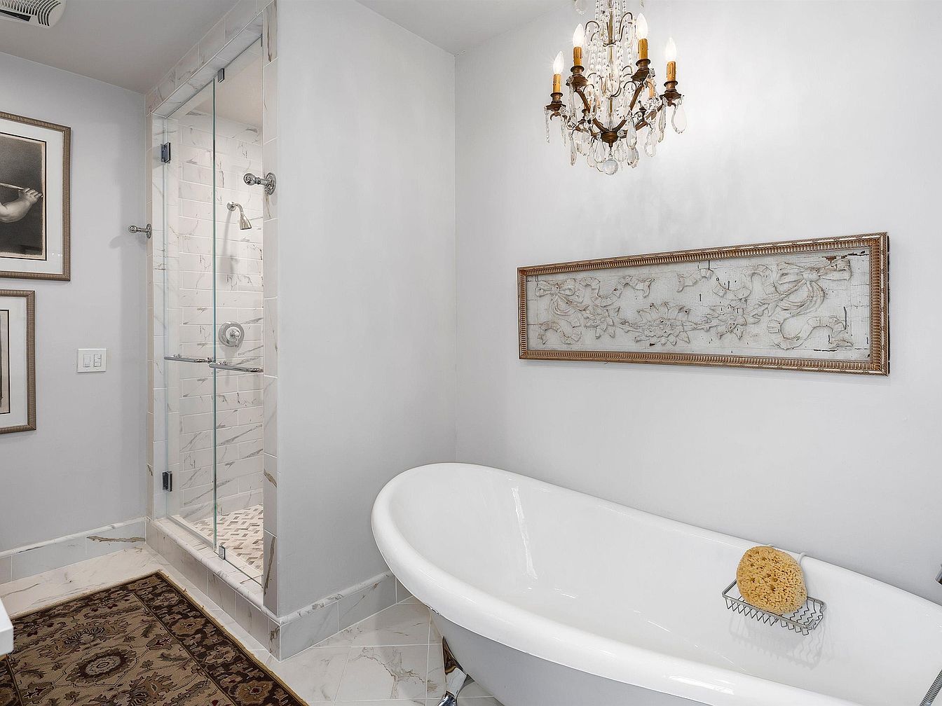 This elegant bathroom features a sleek, freestanding white bathtub that adds a touch of luxury. A glass-enclosed shower showcases a stylish mosaic tiled floor and modern fixtures. The walls are painted in a soft gray, creating a serene atmosphere. Above the tub, a charming chandelier with multiple light bulbs enhances the space’s sophistication. An intricate, framed decorative panel hangs on the wall, highlighting craftsmanship and character. Opposite, framed artwork adds a personal touch. The combination of marble accents and warm textiles, like the richly patterned area rug, creates a harmonious blend of modern comfort and classic design.