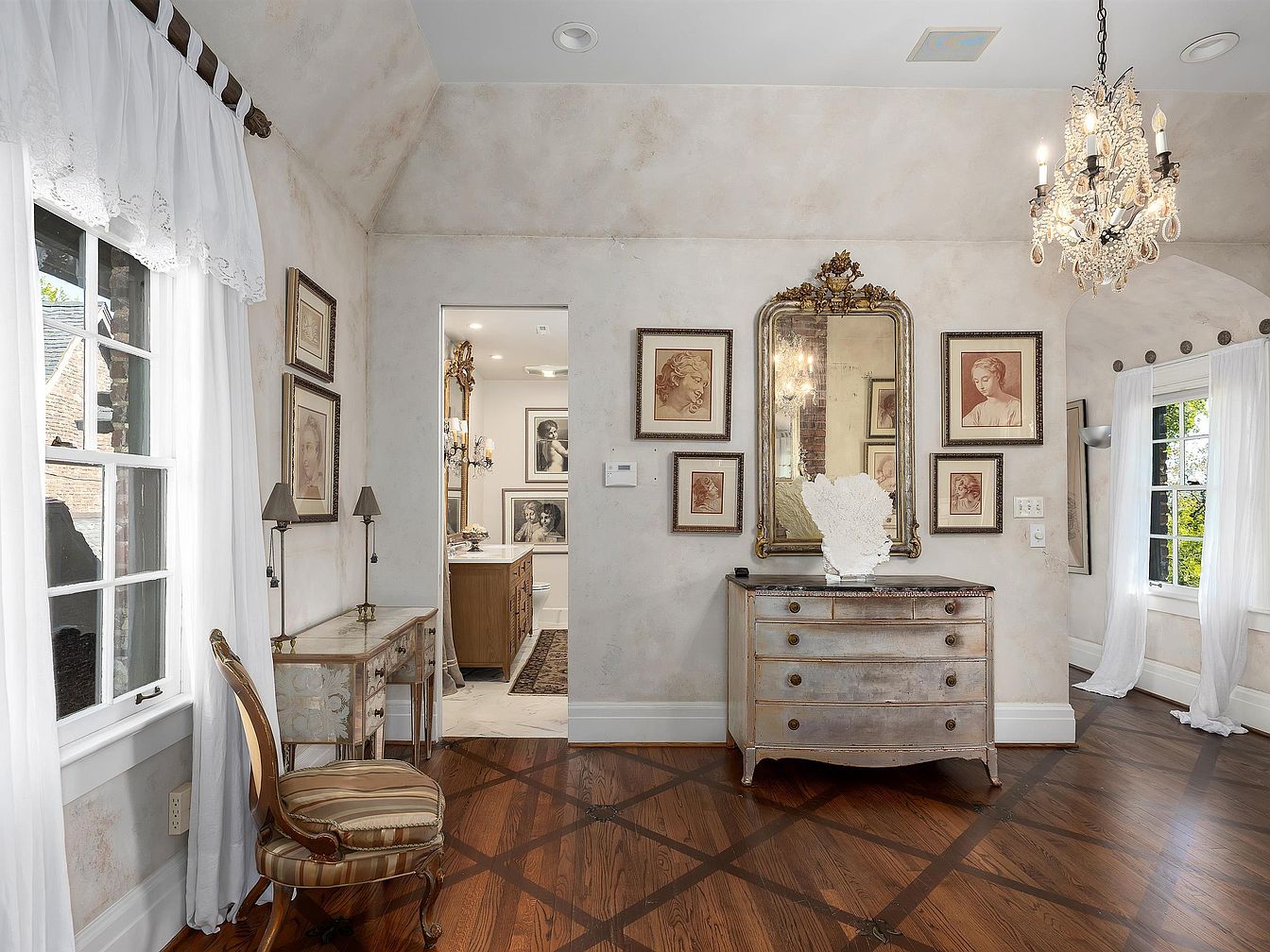 The entry hall features a sophisticated aesthetic, marked by a soft beige wall finish that enhances the warmth of the space. An ornate chandelier hangs from the ceiling, casting a gentle glow over the room. Elegant framed portraits adorn the walls, complemented by a vintage mirror that adds depth. A vintage side table with intricate detailing is paired with a stylish striped chair, creating a cozy nook. Dark hardwood floors showcase a crisscross pattern, enhancing the architectural interest. Sunlight filters through white sheer curtains, inviting a feeling of tranquility and openness.