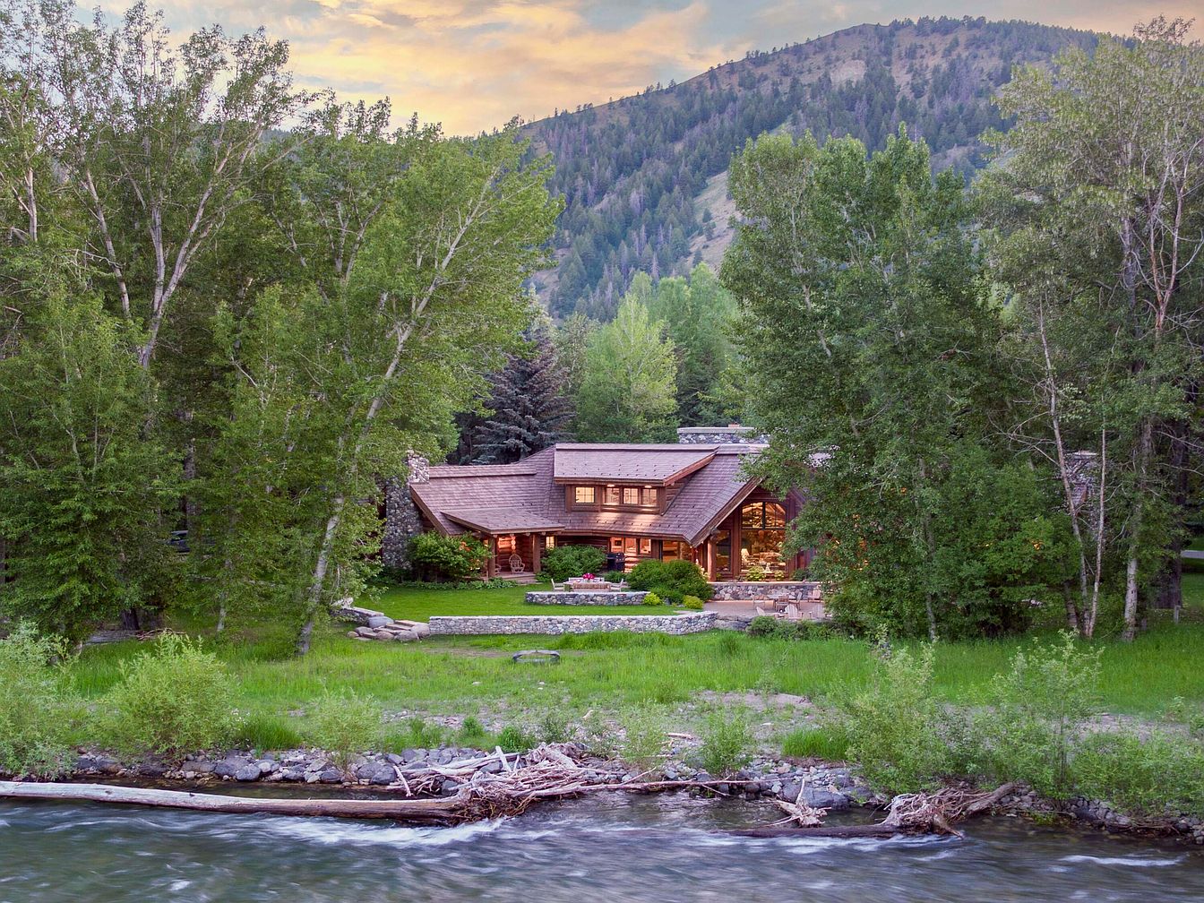 $13M Lodge Estate in Idaho on 7.5 Acres with Big Wood River Frontage, Expansive Views & Riverside Entertaining Spaces
