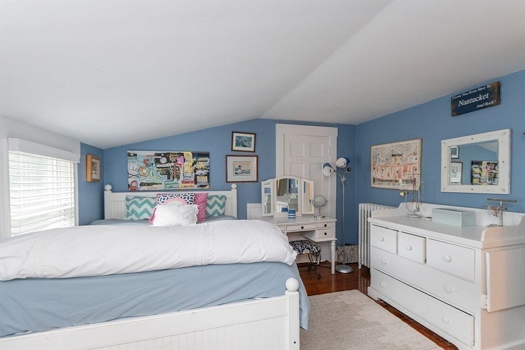 A cozy bedroom with blue walls and white trim features a high white bed with blue and white bedding and an assortment of decorative pillows. Under the slanted ceiling, natural light pours in through two windows, brightening the space. Beneath the left window sits a teal storage bench, topped with a plush teddy bear. To the right of the bed, a white vintage-style vanity with mirror panels and a blue-patterned stool creates a charming nook. Artwork in various frames adds interest to the wall above the bed, while hardwood floors and a light area rug complete the inviting and nostalgic décor.