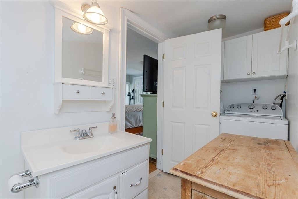 This multifunctional space combines a laundry area and vanity. The foreground features a white vanity unit with a chrome faucet and a matching wall-mounted mirrored cabinet above, flanked by a double sconce light. To the right is a rustic, worn wooden table, bringing a touch of historic charm. The rear section contains a washing machine set beneath white shaker-style cabinetry for storage. Walls, cabinets, and trim are painted crisp white, creating a bright, clean atmosphere. A sturdy door with a brass knob stands open, revealing an adjacent bedroom with hardwood floors. Subtle details lend a practical yet welcoming feel to the room.