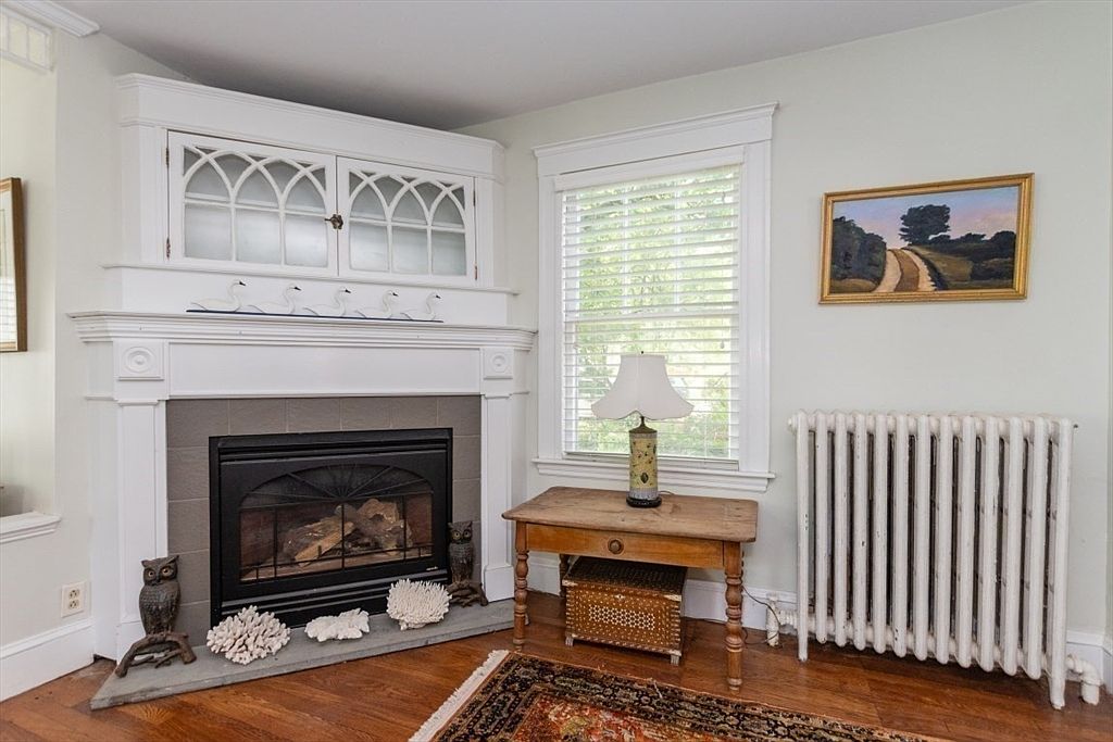 Cozy corner of a traditional living room featuring a white wooden mantle with decorative trim and a tile-surround gas fireplace. Above the mantle, there is a built-in cabinet with glass-front doors framed by an arched, window-like design. To the right of the fireplace, a wood table stands beneath a tall window with white blinds, topped with a vintage-style lamp. An old-fashioned white radiator occupies the space next to the window. A warm rug covers dark wooden floors, and the walls are painted a soft, pale shade. A framed landscape painting completes the inviting, historic ambiance.
