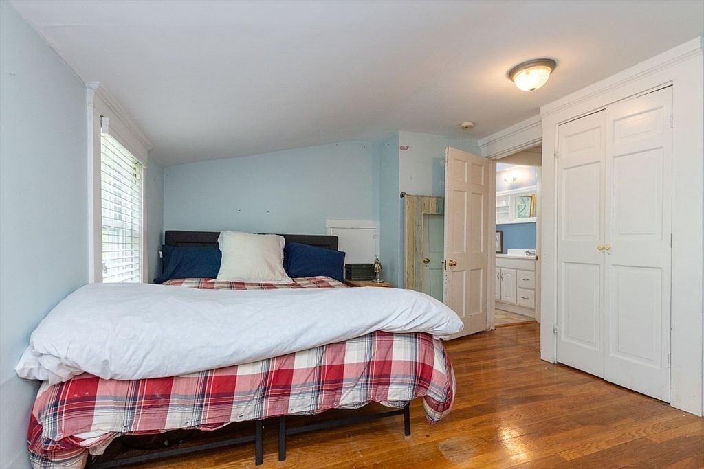 A compact bedroom featuring a sloped ceiling and light blue walls creates a calming atmosphere. The centerpiece is a bed with a red plaid comforter, navy blue pillows, and a large white accent pillow. Natural light pours in through a window with white blinds on the left. Warm-toned hardwood floors add a touch of coziness. Across from the bed, double closet doors with round knobs offer storage. The open door reveals a glimpse of an adjacent bathroom with white cabinetry and soft lighting. The room balances rustic charm with a touch of simplicity through its minimal decor and unfussy finishes.
