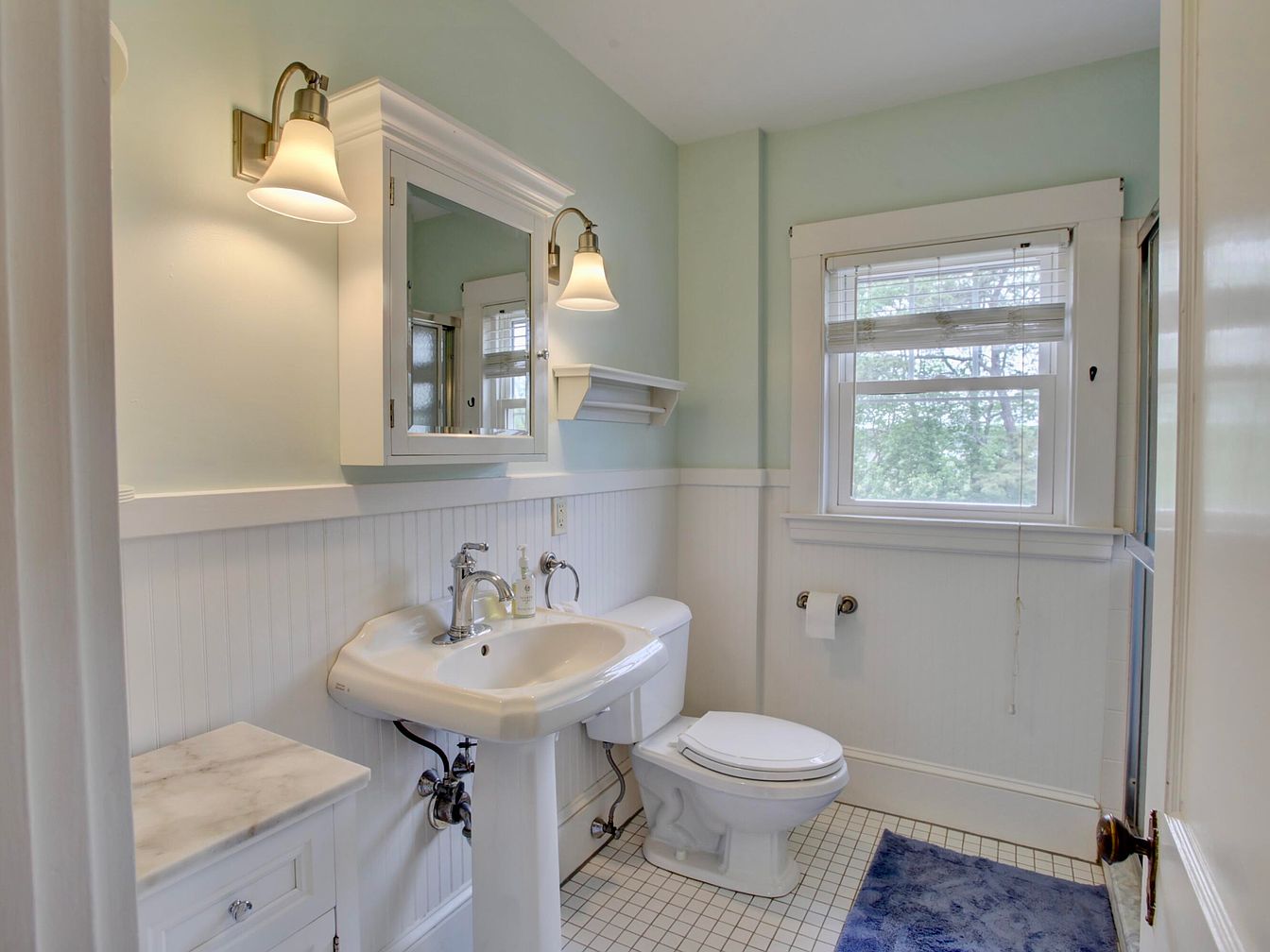 A compact and inviting bathroom with soft green upper walls and crisp white beadboard paneling below, creating a fresh, airy ambiance. To the left sits a marble-topped cabinet next to a pedestal sink with chrome fixtures, complemented by a large mirrored medicine cabinet above. Flanking the mirror are two brass wall sconces with frosted glass shades, adding warm light. A white toilet sits beside the sink, with a shelf and window above bringing in natural daylight, framed by white wood trim. Clean tile flooring in a grid pattern and a blue bath mat complete the look, blending classic and contemporary style.