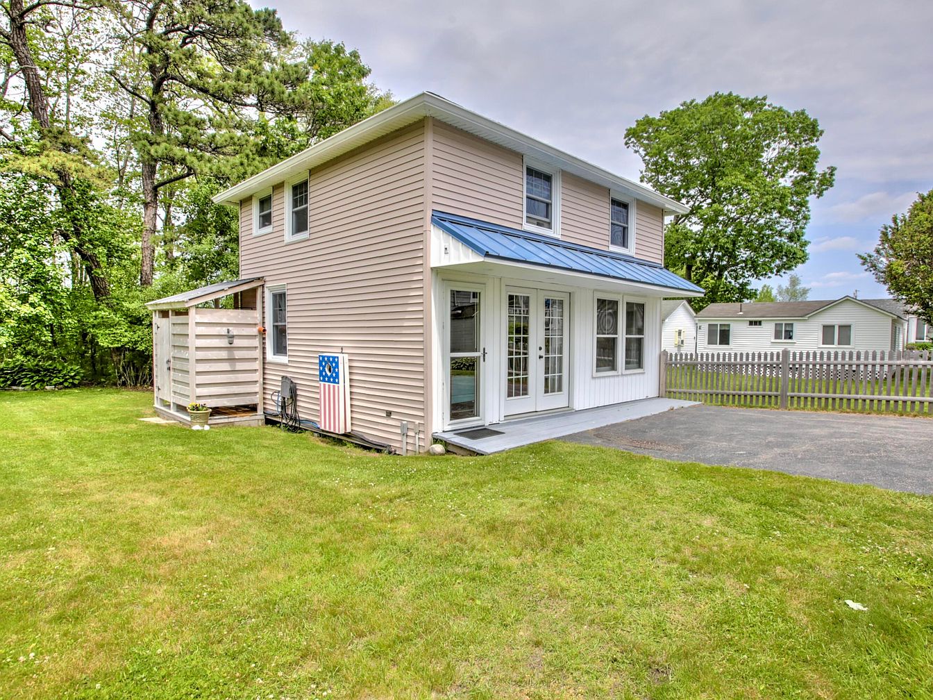 A two-story house with light beige siding and white trim sits on a neatly manicured lawn, bordered by mature trees and a picket fence. The back features double French doors leading onto a small porch with a metal awning, blending charm and practicality. Adjacent to the house is a small, partially enclosed wooden outdoor shower or utility space. The yard feels welcoming and spacious, providing ample green space for relaxation or play. American-themed decor adds a touch of personality, while neighboring homes and quiet surroundings reinforce a sense of community and traditional suburban comfort.
