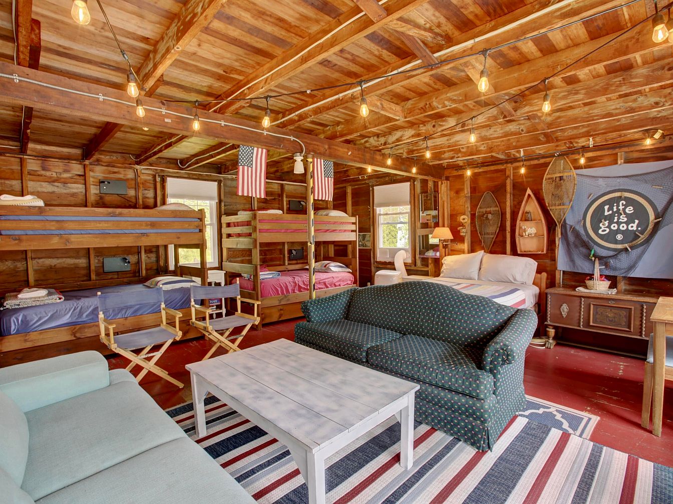 A spacious, rustic bunk room featuring exposed wooden beams and walls, filled with a warm golden glow from stringed Edison-style bulbs. Several sets of wooden bunk beds, dressed in colorful bedding of reds, blues, and purples, line one wall. In front, two patterned couches and a pale wooden coffee table sit atop a red, white, and blue striped rug. American flags hang from ceiling beams, and vintage wooden snowshoes and oars decorate the walls. A cozy bed stands in the corner by a lamp and small cabinet, while a large “Life is good” banner adds a touch of charm and cheer.