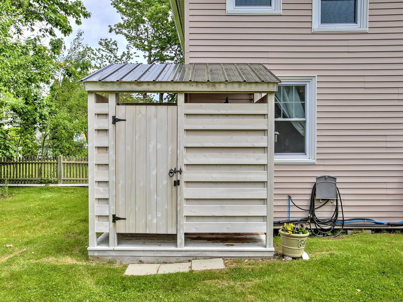 A small wooden outdoor shower stands beside the pale tan clapboard siding of a house. The structure features horizontal light wood planks, a pitched metal roof, and a central door secured with black iron hinges and latch. Concrete pavers create a simple pathway up to the raised wooden threshold. To the right, a large ceramic planter filled with colorful flowers sits on the neatly mowed green lawn, near coiled hoses and exterior utility equipment. The backdrop includes windows with white trim, a picket fence, leafy trees, and a peaceful suburban garden vibe.