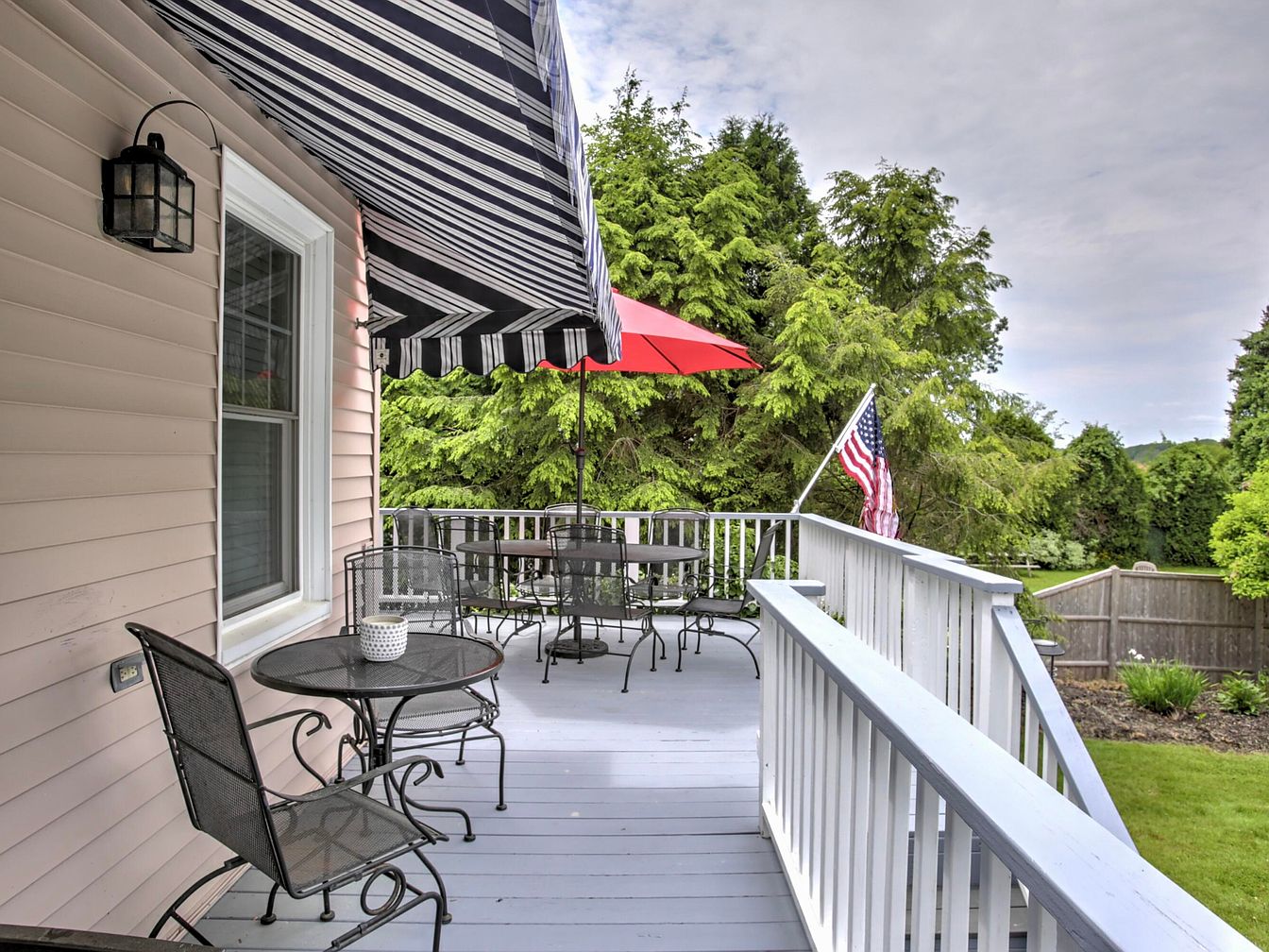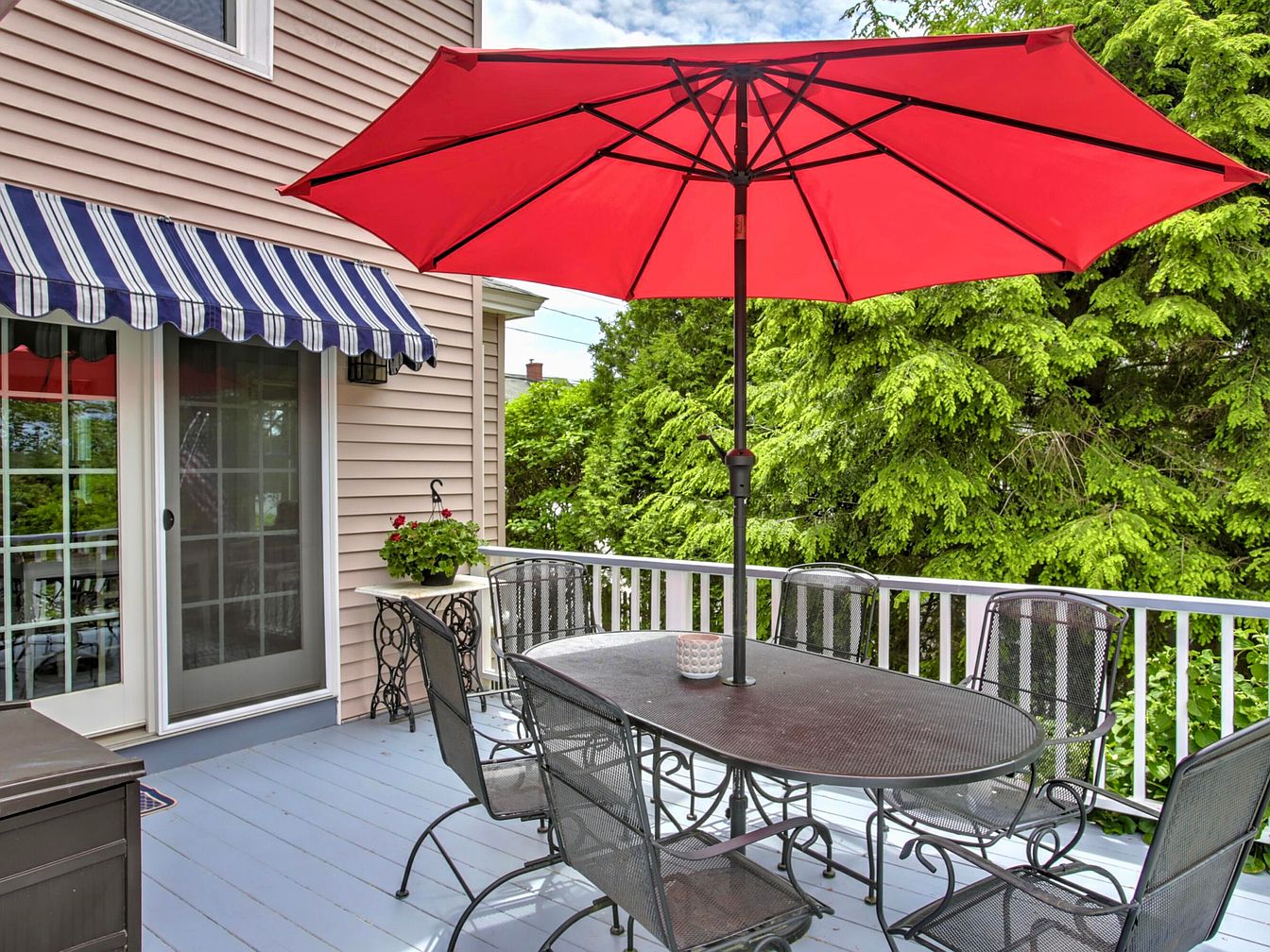 A spacious outdoor patio features a soft blue wooden deck, surrounded by white railing. The centerpiece is an oval, black wrought-iron table with six matching chairs, offering ample space for gatherings or meals. Atop the table sits a stylish candle holder. Shading the area is a large, vibrant red umbrella, providing a bold accent of color. The house’s light tan siding contrasts gently with a navy-and-white striped awning above a sliding glass door. Potted flowers add a touch of natural greenery, while lush pine trees create a serene, private backdrop around the patio.