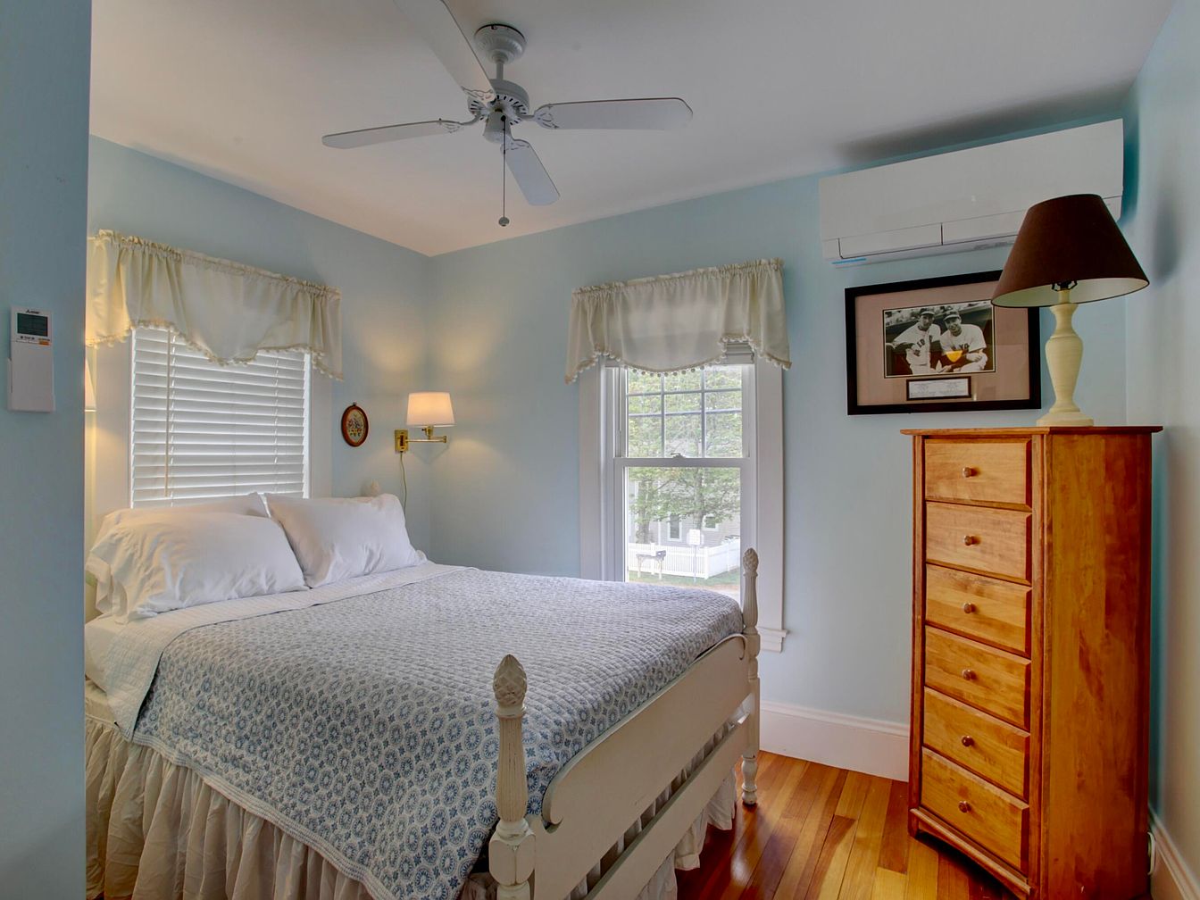 A serene bedroom featuring pale blue walls and white trim, creating a soothing and airy atmosphere. The bed, dressed in white and pastel patterned bedding, sits between two windows with white blinds and gathered valances. Warm wood floors contrast gently with the room’s cool palette, and a tall wooden dresser stands to the right, topped by a cream-colored lamp with a brown shade. Above the dresser hangs a black-and-white photo in a simple black frame. Wall-mounted lighting and a ceiling fan provide illumination and comfort, and an air conditioning unit is discreetly placed above the framed photo.