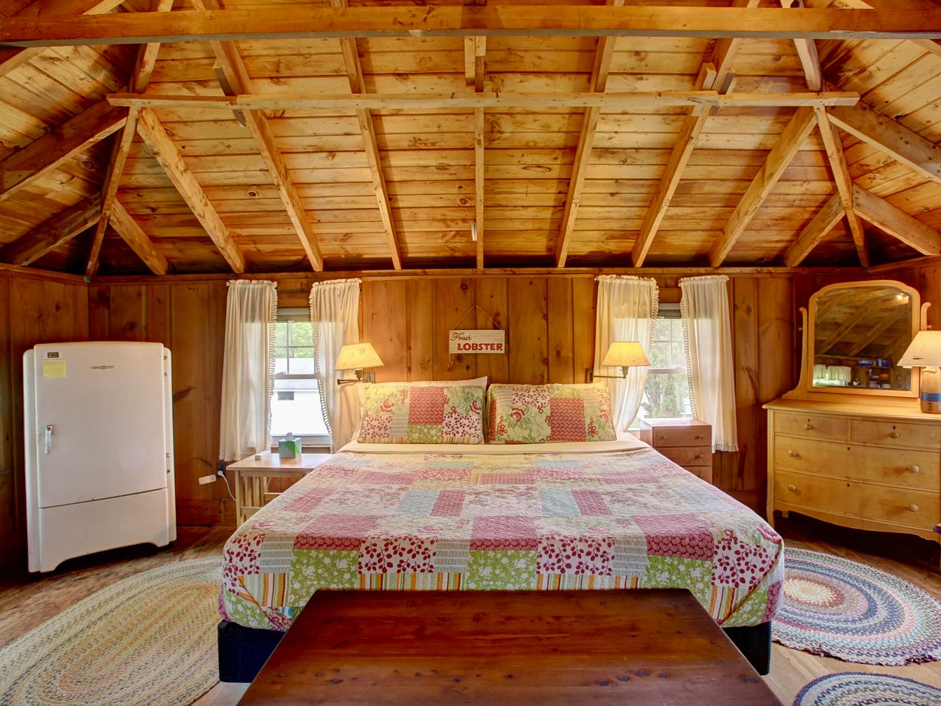 A cozy bedroom with exposed wooden rafters and walls lined in warm, honey-toned wood paneling. The large bed features a colorful patchwork quilt with floral and striped patterns in soft reds, greens, and yellows, complemented by matching pillows. Two windows dressed in white ruffled curtains let in natural light, flanked by wooden nightstands each holding a lamp with a beige shade. An antique white refrigerator stands in one corner while a vintage wooden dresser with an arched mirror and lamp sits on the other side. The floors are covered with braided oval rugs in earthy tones, enhancing the cabin-like, rustic atmosphere.