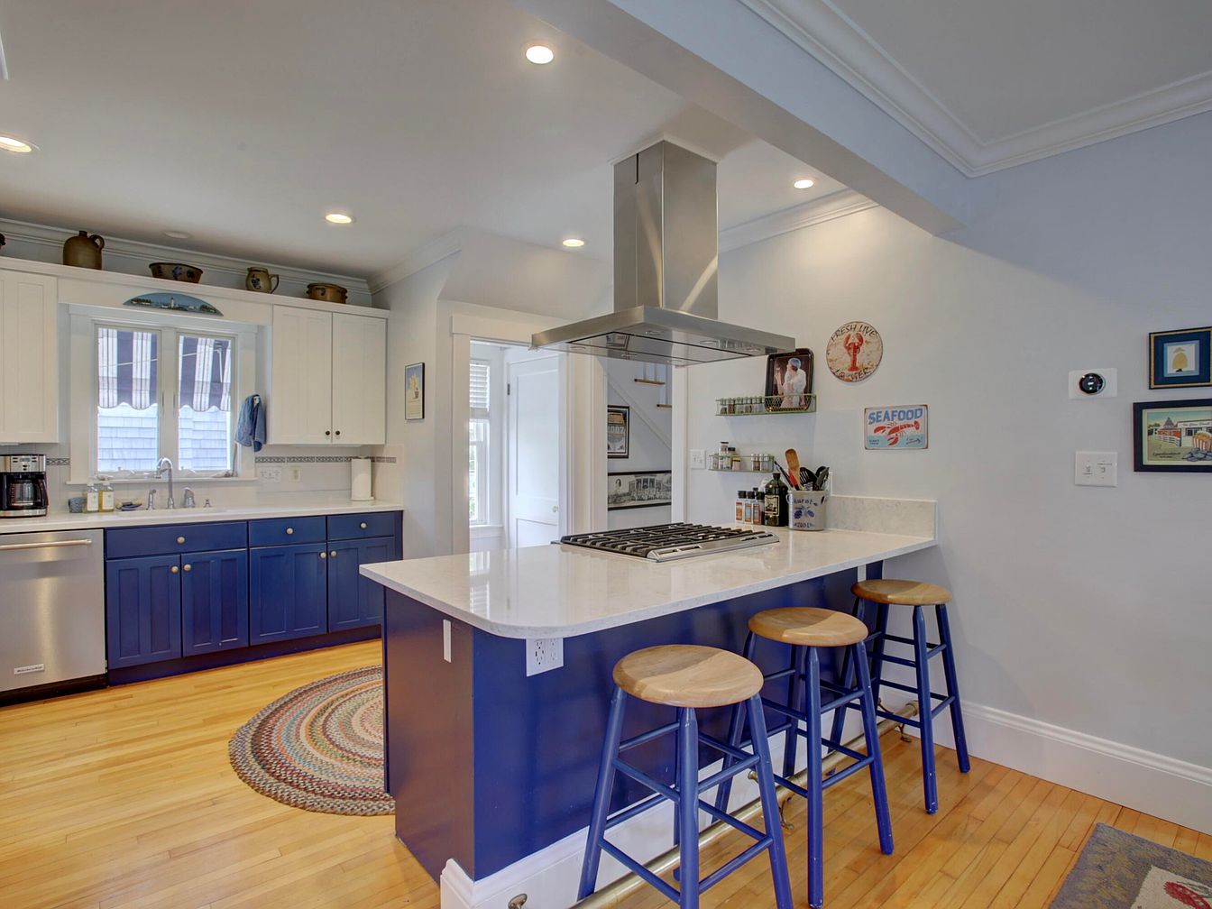 A bright, spacious kitchen with coastal charm features a prominent white quartz-topped island with navy blue cabinetry beneath. Three wooden barstools with blue-painted legs line the island, facing a modern cooktop with a sleek stainless-steel vent hood above. The surrounding cabinetry contrasts with deep blue lower cabinets and crisp white uppers, with retro pottery displayed above. A round woven rug sits on polished honey-toned hardwood floors. Soft blue-gray walls are adorned with vintage seafood signs and small framed art, creating a relaxed, inviting atmosphere. Stainless steel appliances and ample counter space lend both function and modern style.