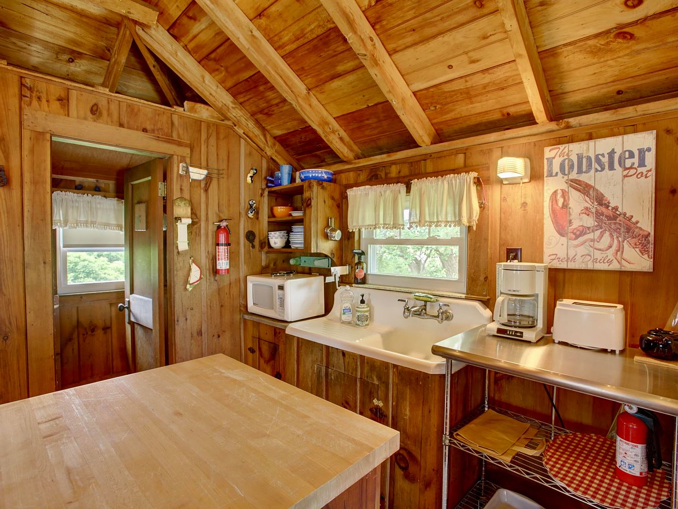 Warm wood paneling encompasses the kitchen, including the ceiling’s exposed beams and the walls, creating a cozy and natural cottage feel. The kitchen features a large butcher block island at its center, a deep farmhouse sink under a double window with frilly, cream-colored curtains, and open shelves holding colorful plates and glassware. Appliances like a white microwave, coffee maker, and toaster are neatly arranged on wood and stainless steel countertops. Nautical decor and a vintage-style lobster sign contribute to a coastal, lived-in charm. Natural light filters through the window, enhancing the golden glow of the wood.