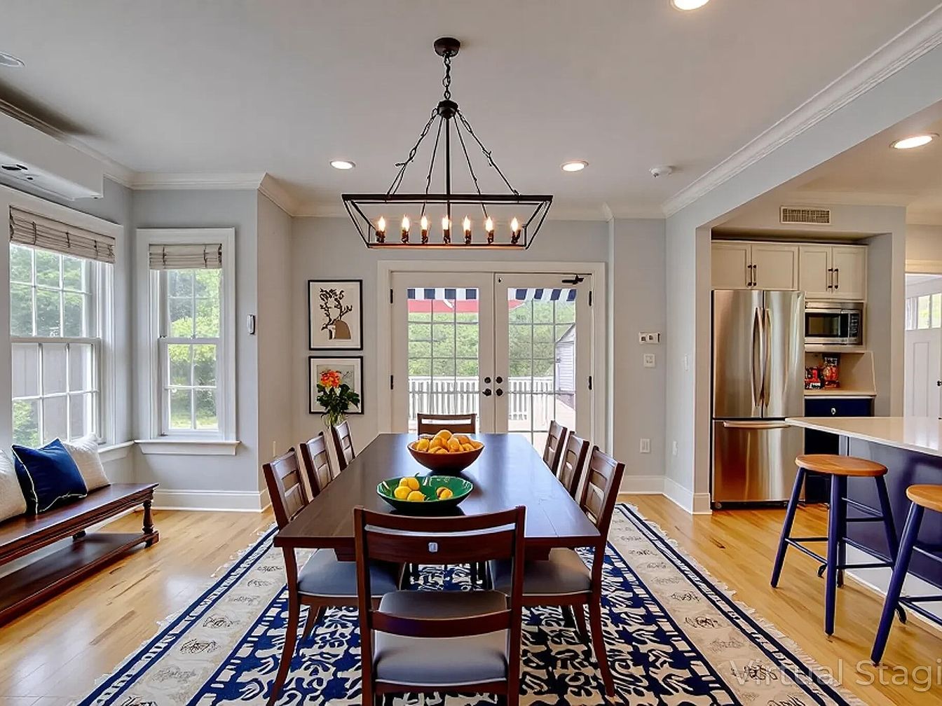 A sunlit dining space features a long wooden table surrounded by eight matching chairs, centered on a bold blue and white patterned rug. Adjacent to the dining set, a wooden bench with cream and navy pillows sits below a row of large windows with woven blinds, letting in natural light. On one wall, framed art and a bouquet of orange flowers add visual interest. Overhead, a black iron chandelier with exposed bulbs lends a classic touch. In the background, French doors open onto a deck with striped awnings. A nearby kitchen area showcases a stainless-steel refrigerator and a breakfast bar.