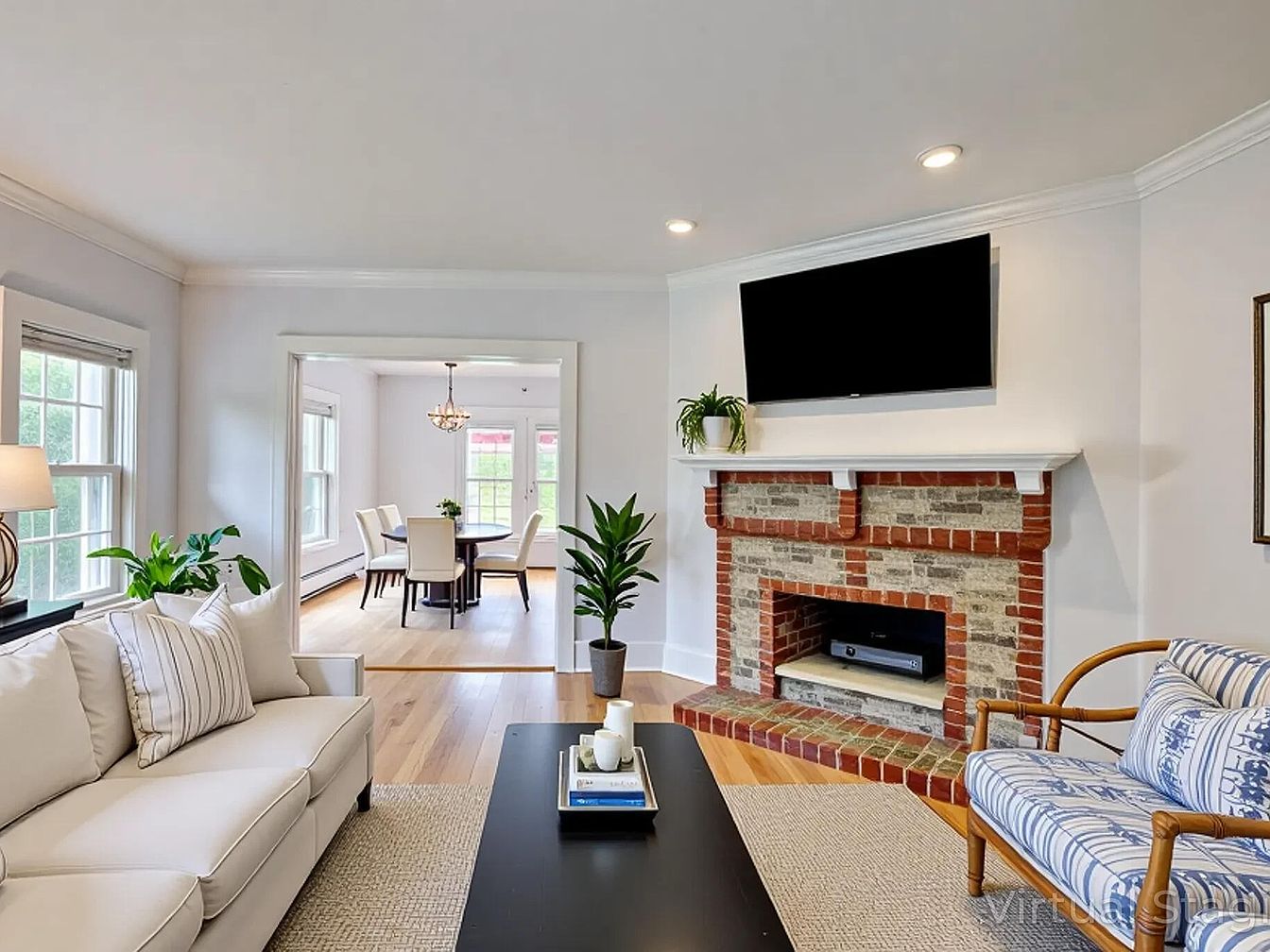 Cozy living room with crisp white walls and crown molding, featuring a brick fireplace with a sturdy white mantel as the focal point. Above the mantel, a large flat-screen TV offers a contemporary touch. The room is furnished with a plush cream sofa with striped pillows and a rattan accent chair with blue and white upholstery. A black coffee table sits atop a neutral woven rug. Large windows let in natural light, and decorative plants add a fresh, welcoming accent. In the distance, an open doorway leads to a bright dining area with a round table and upholstered chairs, enhancing the airy, open layout.