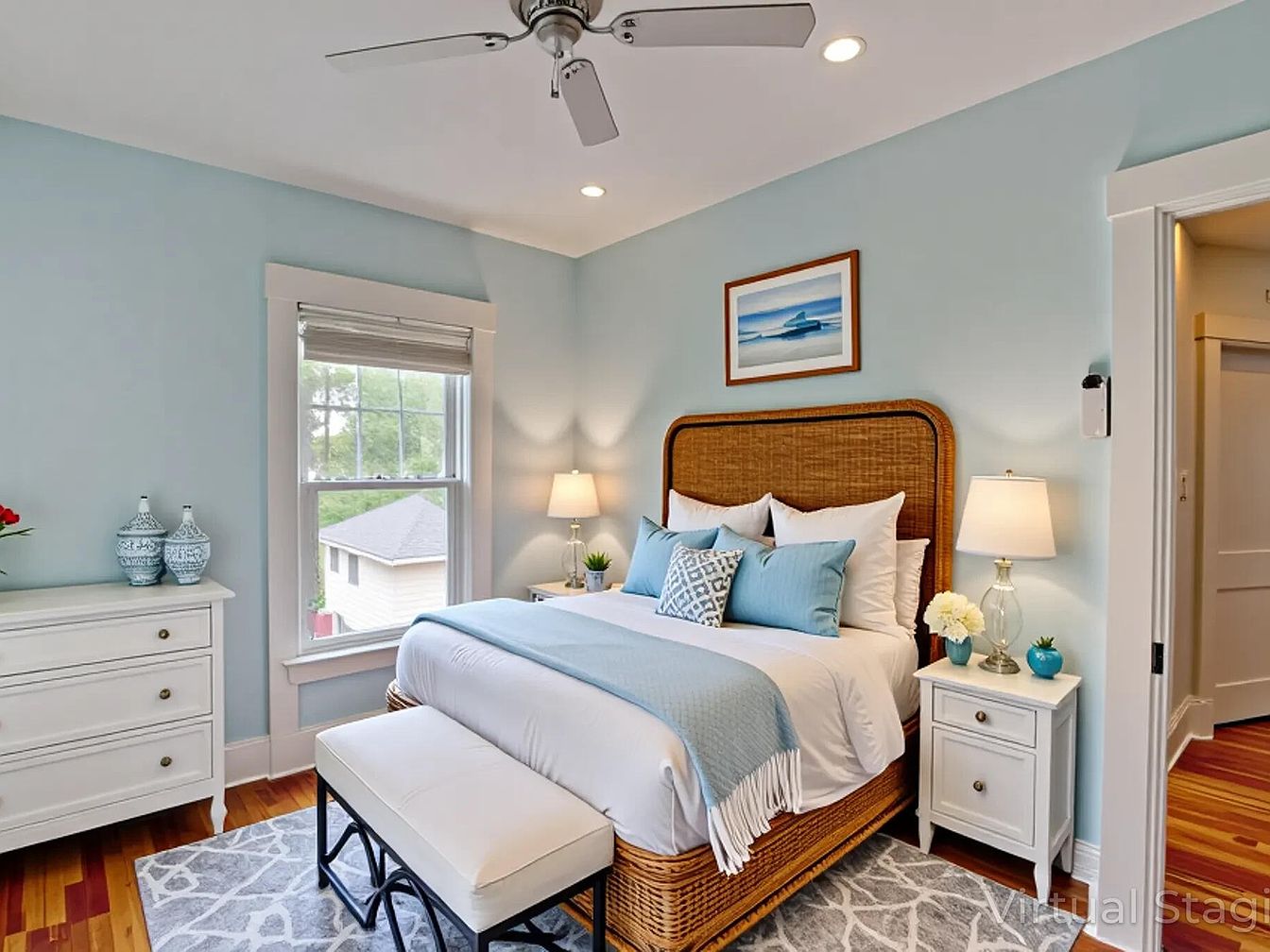 This tranquil bedroom features soft sky-blue walls, complemented by crisp white trim and ceilings with recessed lighting and a modern ceiling fan. The bed, with its woven rattan frame and light blue and white bedding, serves as the centerpiece, flanked by matching white nightstands and classic lamps. Two white dressers adorned with blue-and-white patterned vases add a touch of sophistication. A large window lets in ample natural light, showcasing the leafy outdoor view. A tufted white bench sits at the foot of the bed atop a pale gray rug with abstract patterns, creating a serene and inviting atmosphere.