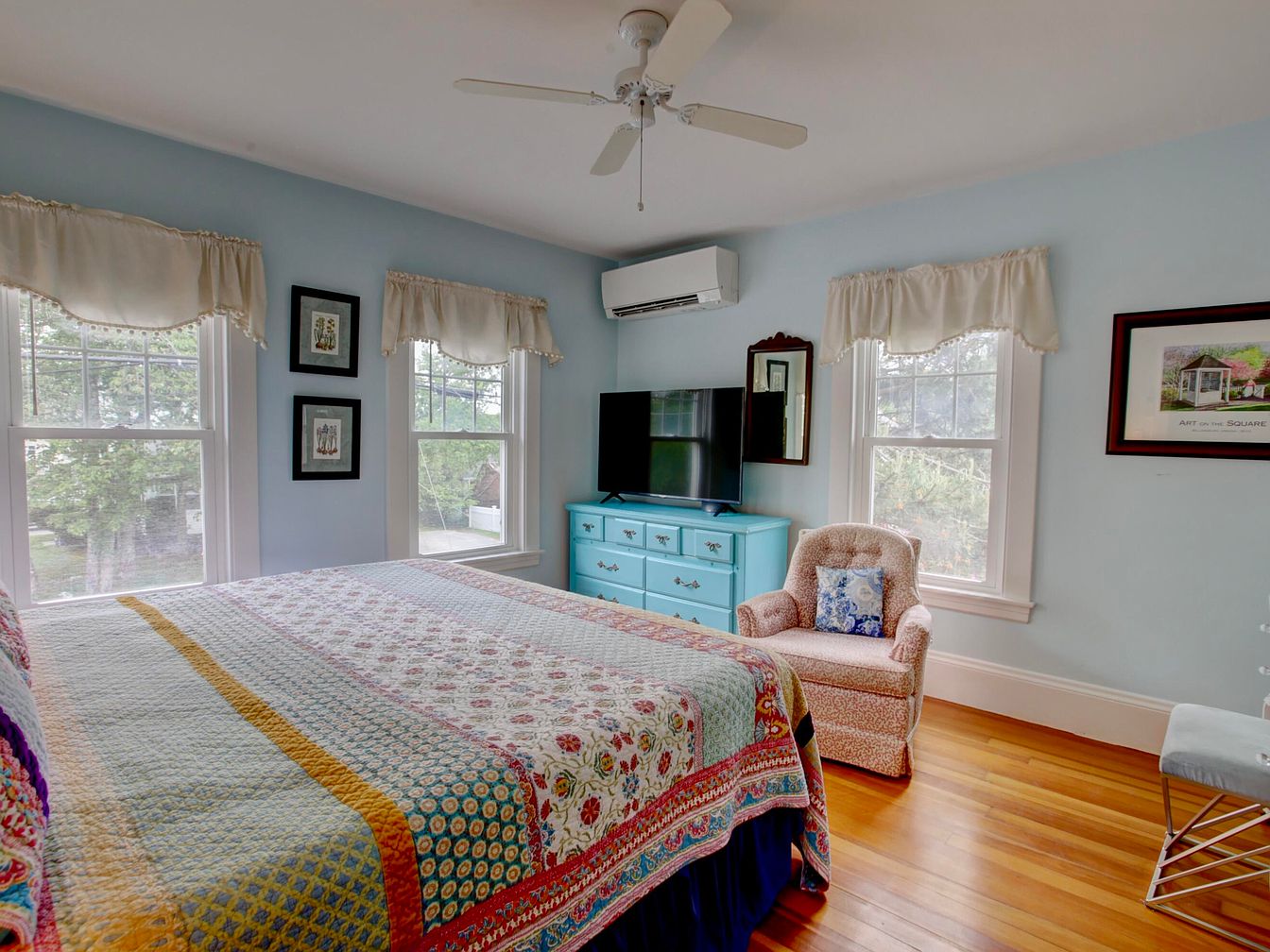 A cozy bedroom space features soft blue walls accented by large white-trimmed windows that let in abundant natural light. The queen bed takes center stage, adorned with a cheerful, multi-patterned patchwork quilt in pastel shades and rich reds, yellows, and blues. Beneath the windows, a turquoise-painted dresser adds a bright contrast, topped with a modern flat-screen TV and flanked by a mirror. An overstuffed, beige armchair with a blue-patterned throw pillow sits to the right, enhancing the inviting feel. White curtains with a ruffled edge frame the windows while art and framed prints decorate the walls. Warm honey-toned wooden floors ground the tranquil scene.