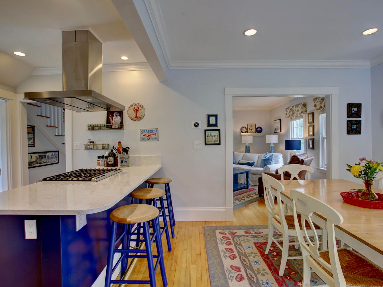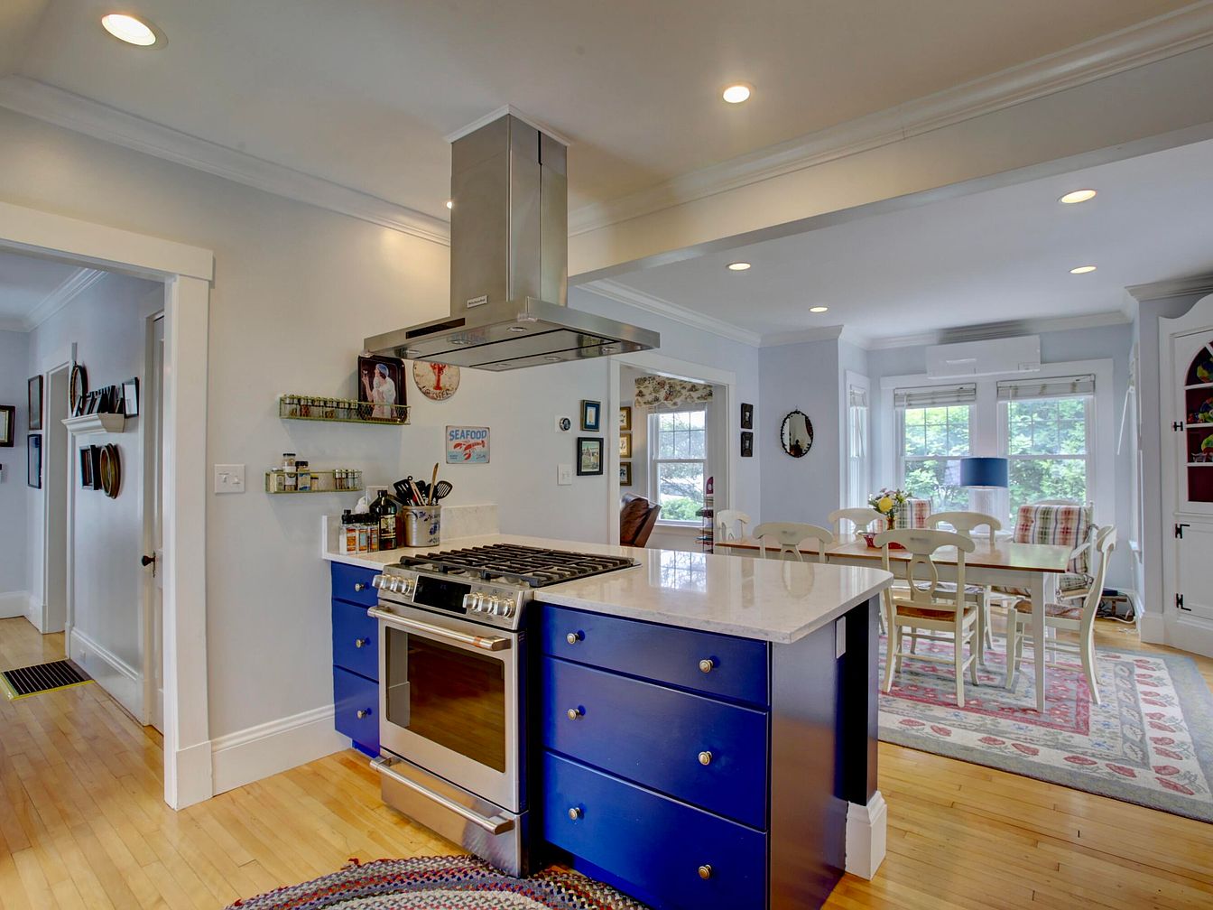 This space features an open-concept kitchen and dining area with a fresh yet classic ambiance. The kitchen showcases a striking blue island with polished countertops and a modern gas range, complemented by a sleek overhead vent. Compact wall shelves hold jars and spices, adding convenience alongside subtle vintage decor touches. The hardwood floor continues seamlessly into the dining area, where a large table with white wooden chairs sits atop a vibrant patterned rug. The area is bathed in natural light from large windows framed by light-colored walls, while eclectic details, such as plaid-cushioned bench seating and decorative wall art, provide warmth and character.