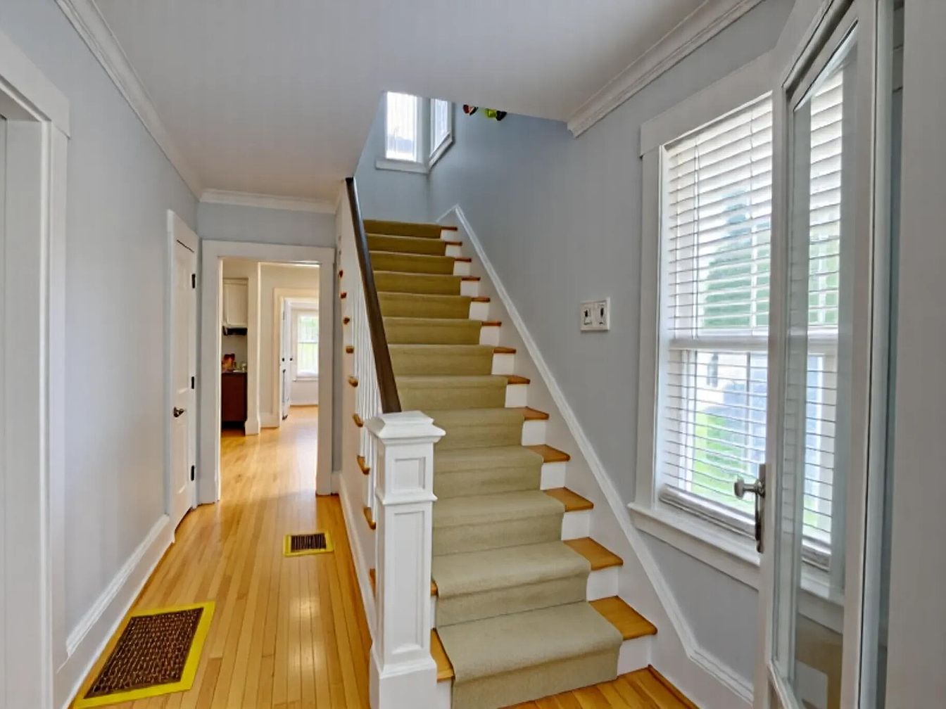 A bright and airy entryway features a staircase with beige carpeted steps and wooden treads, complemented by a white balustrade. Walls are painted in a soft gray, enhanced by detailed crown molding and white trim around doors and windows. Natural light pours in from large windows with white blinds on the right, illuminating the honey-toned hardwood floors. The hallway leads toward an adjacent room, with multiple doorways visible in the background. Floor vents with yellow borders add a touch of character to the otherwise minimal and elegant space, emphasizing traditional yet timeless interior aesthetics.