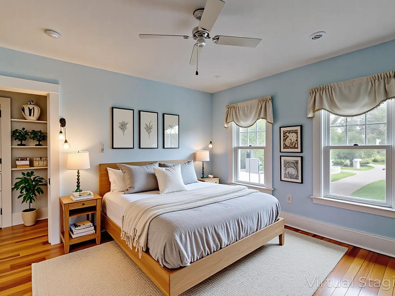 A bright and welcoming bedroom features soft blue walls complemented by white trim and large windows with cream-colored valances, allowing natural light to fill the space. A platform bed with a wooden frame is centered against the wall, dressed in gray and white bedding with coordinating throw pillows and a blanket. On each side of the bed are matching wooden nightstands with modern lamps. Above the headboard, a trio of botanical prints brings a calming, nature-inspired element to the room. Built-in shelves, adorned with potted plants and neatly stacked books, add both function and decorative interest. Honey-toned hardwood floors and a textured cream area rug complete the cozy, inviting atmosphere.