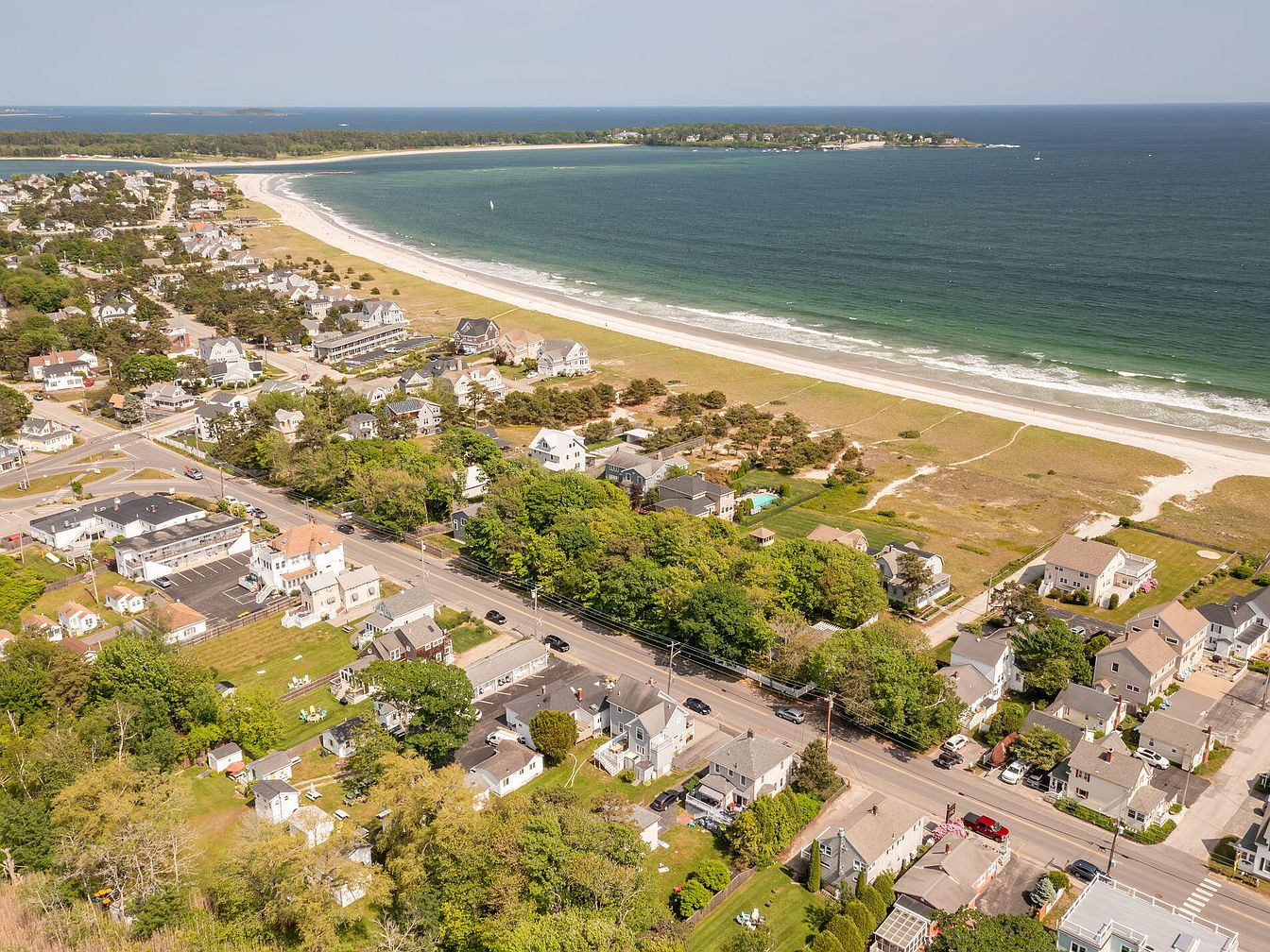 A sweeping aerial view features a picturesque coastal neighborhood set beside a sandy, crescent-shaped shoreline, with the deep blue ocean meeting thin lines of surf. The community is characterized by historic New England-style houses clustered along narrow grid roads, and dotted among mature green trees. Large grassy dunes separate the homes from the beach, offering natural buffer and uninterrupted views out to the open bay. Architectural details include steeply pitched roofs, gables, and classic shingled facades, with some houses painted in muted pastels and whites. The laid-back, seaside aesthetic provides a peaceful contrast to the dynamic, expansive coastline.