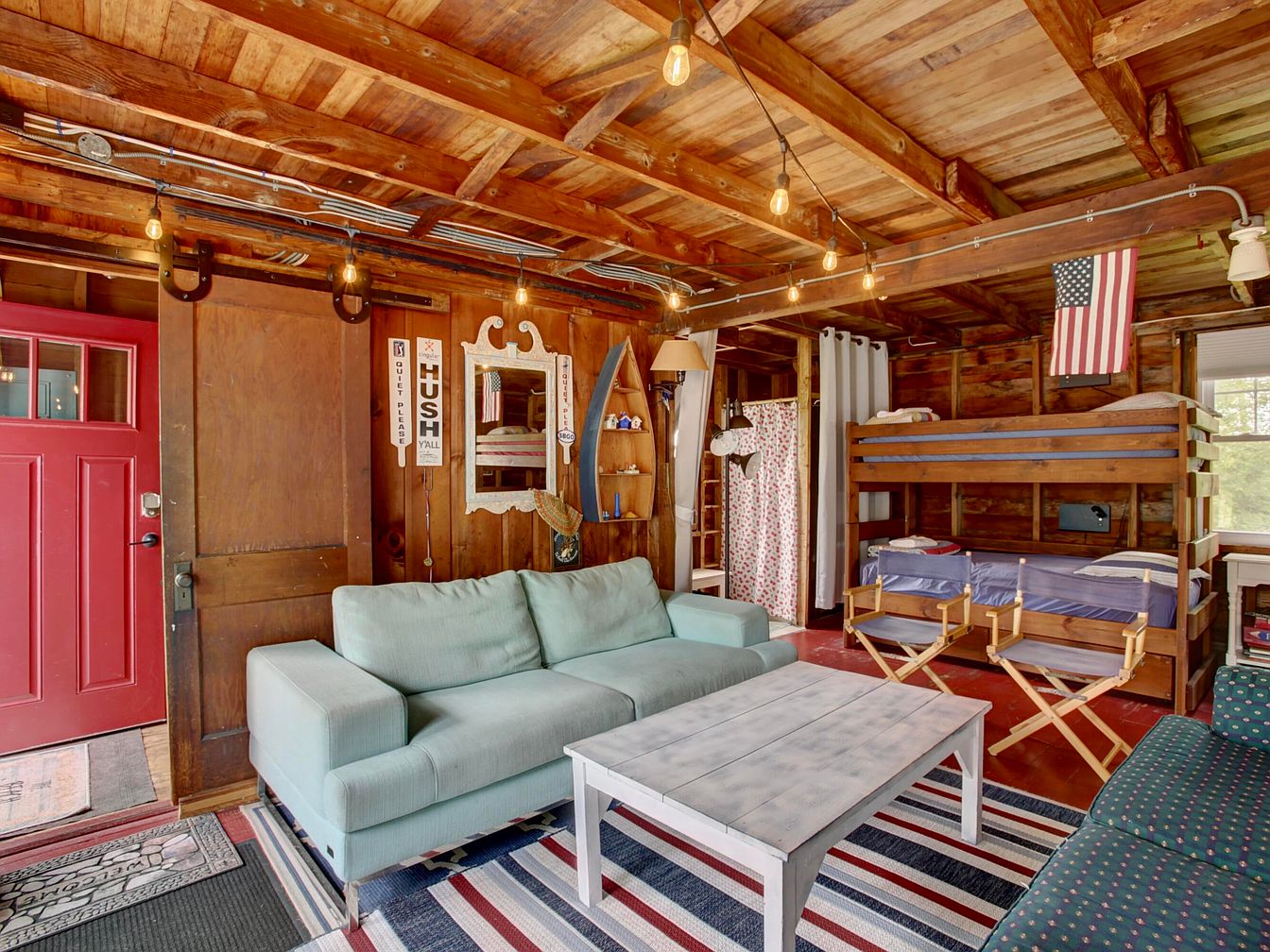 This cozy space blends rustic charm with playful Americana. The walls, ceiling, and beams are rich, warm wood, with exposed pipes and retro hanging bulbs adding vintage character. A bold red front door stands out beside a light blue sofa, which faces a distressed white coffee table atop a striped rug in red, white, and blue hues. On the right, wooden bunk beds with blue bedding are framed by classic director-style chairs, all in front of an American flag accent. Small shelves, a decorative mirror, and whimsical signage complete the relaxed, cabin-style aesthetic.