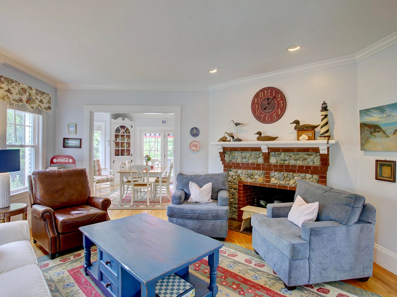 A cozy living room features a stone and brick fireplace with a white mantel, topped by decorative items like carved duck figurines and a striped model lighthouse. A large maroon wall clock hangs above the mantel. Two plush blue armchairs flank the fireplace, with a brown leather armchair and white sofa completing the seating area around a blue wooden coffee table. Hardwood floors are partially covered by patterned rugs in warm tones. The walls are painted soft white, and there’s a window with floral curtains letting natural light in. A doorway opens to a sunlit dining area, enhancing the space’s welcoming, cottage-style charm.