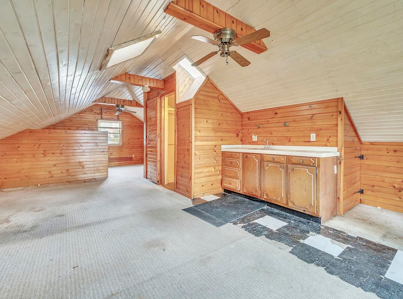 This attic space features a cozy, rustic aesthetic with wood-paneled walls and ceiling, offering warmth and character. The sloped ceiling enhances the room’s unique shape, creating an inviting atmosphere. Two skylights allow natural light to flood the area, emphasizing the rich wood tones. An exposed ceiling fan provides ventilation, while brown carpet outlines the room, contrasting with the light wood. A small kitchenette is present, showcasing an old-fashioned counter with wooden cabinets that reflect vintage design. The floor transitions from carpet to a black and white stone pattern, adding visual interest, making it ideal for a creative retreat or cozy hideaway.