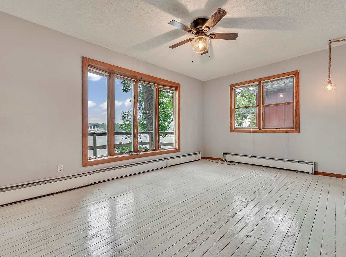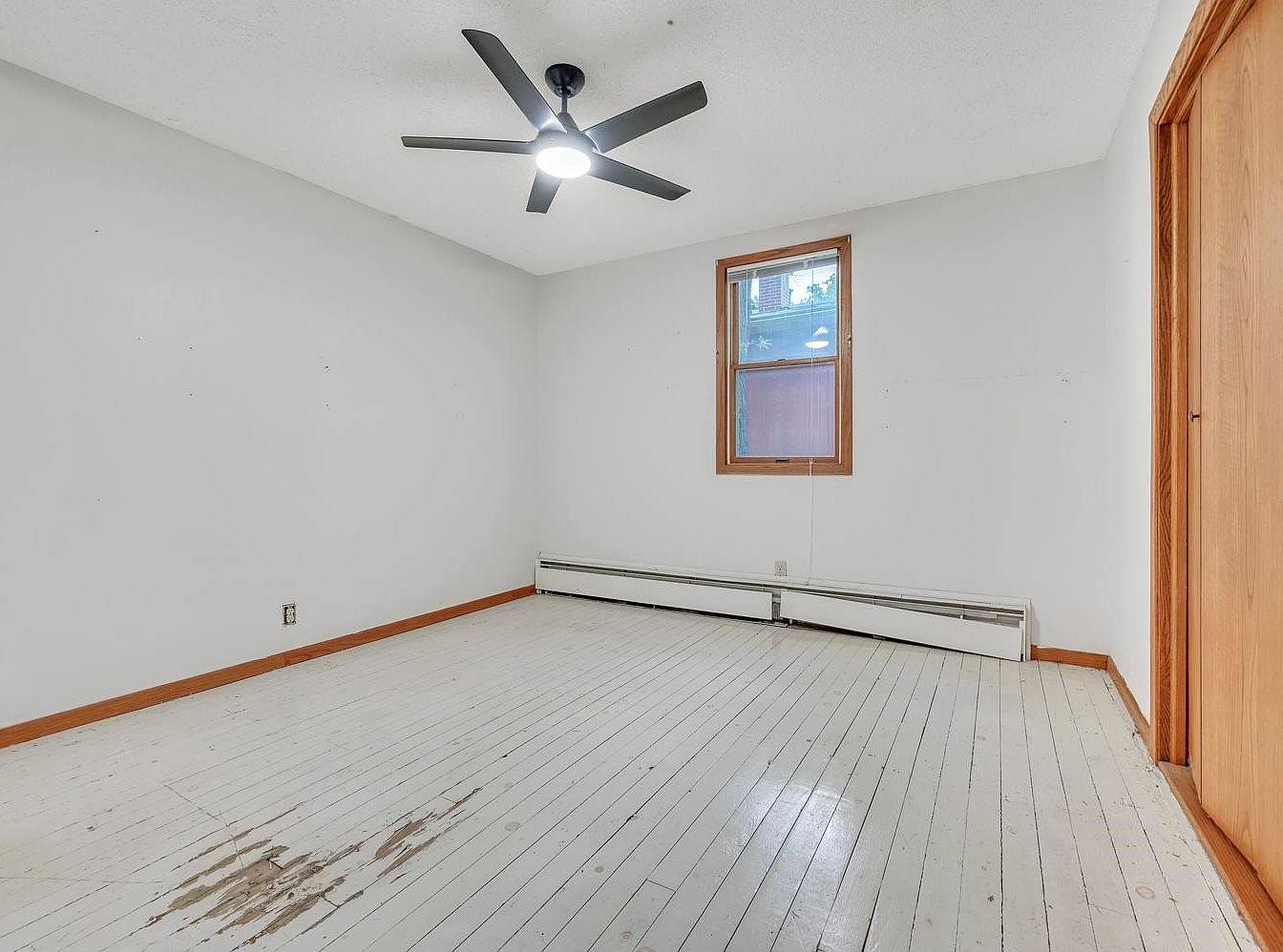 The space is a spacious bedroom featuring a simple and minimalistic design. Light gray walls and whitewashed wooden floors create a bright and airy feel. A centrally mounted black ceiling fan adds a modern touch. A medium-sized window allows natural light to flood in, framed by polished wood trim. To one side, a wooden closet door provides storage, complementing the room’s warm tones. Overall, the aesthetic is clean and open, inviting personalization and comfort. The layout emphasizes functionality, leaving ample space for furniture arrangement, making it a versatile area for relaxation or study.