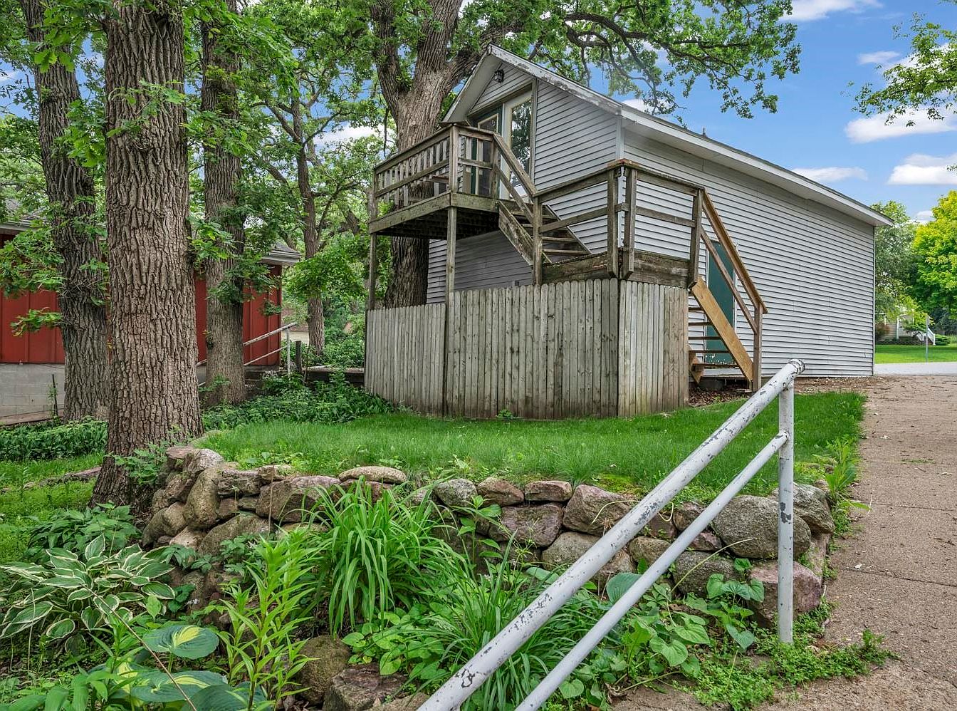The image showcases the exterior of a charming structure nestled amidst large, mature trees, revealing a two-story design with a cozy balcony. The home features grey siding complemented by a sturdy wooden deck, providing a welcoming entrance. The rustic wooden fence encloses a grassy area, enhancing the natural ambiance. A stone wall borders the lush garden, dotted with vibrant green plants and flowers, creating a harmonious blend of nature and architecture. Sunlight filters through the leaves, casting dappled shadows on the ground, while the clear sky adds to the tranquil, inviting atmosphere.